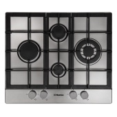 Описаниеповерхность газовая независимая, 60 см, газ на металле, 4 конфорки, решетки чугунные, нержавеющая сталь