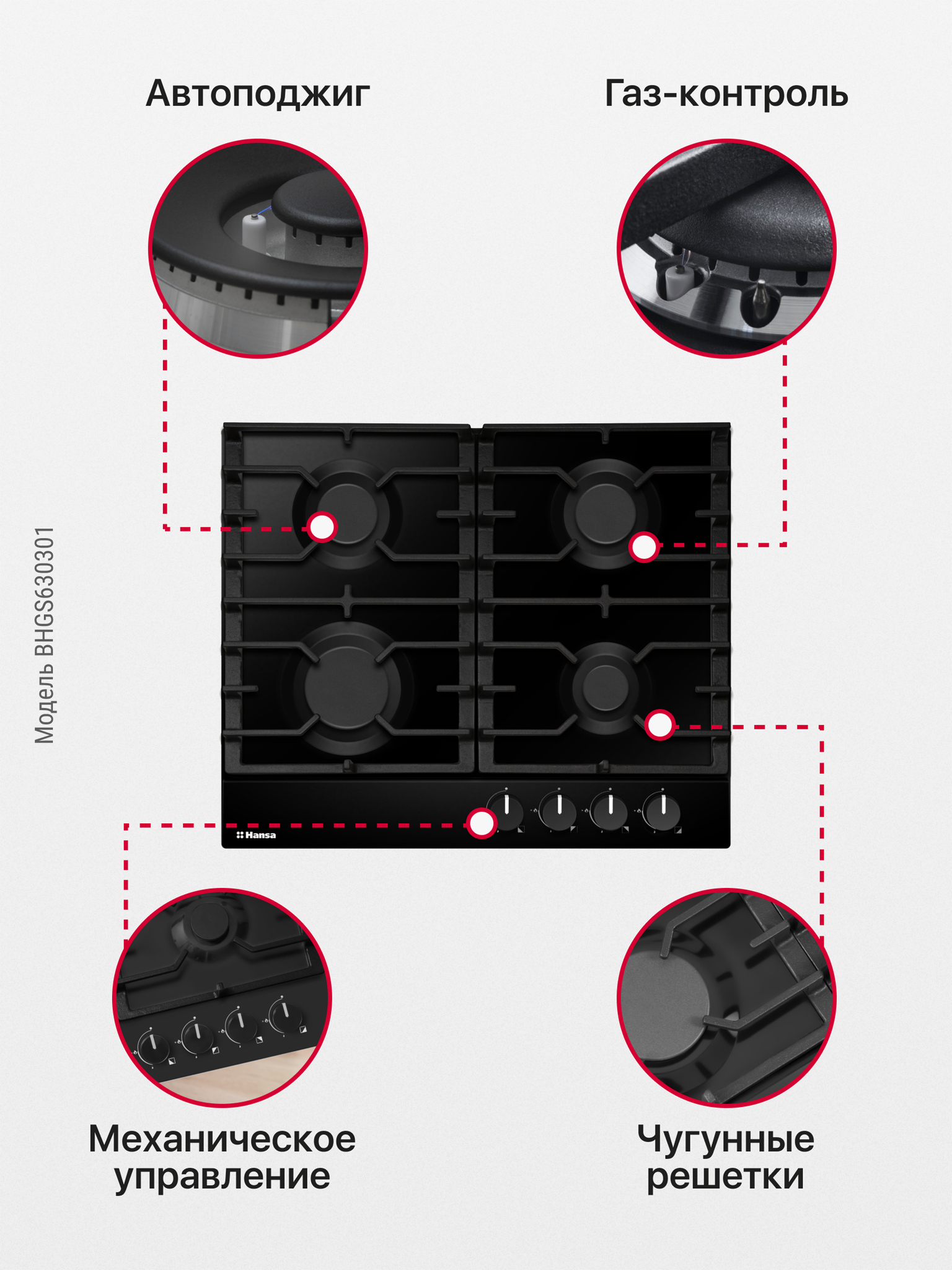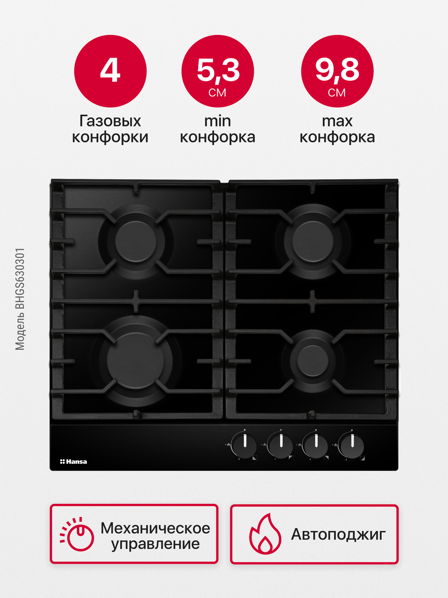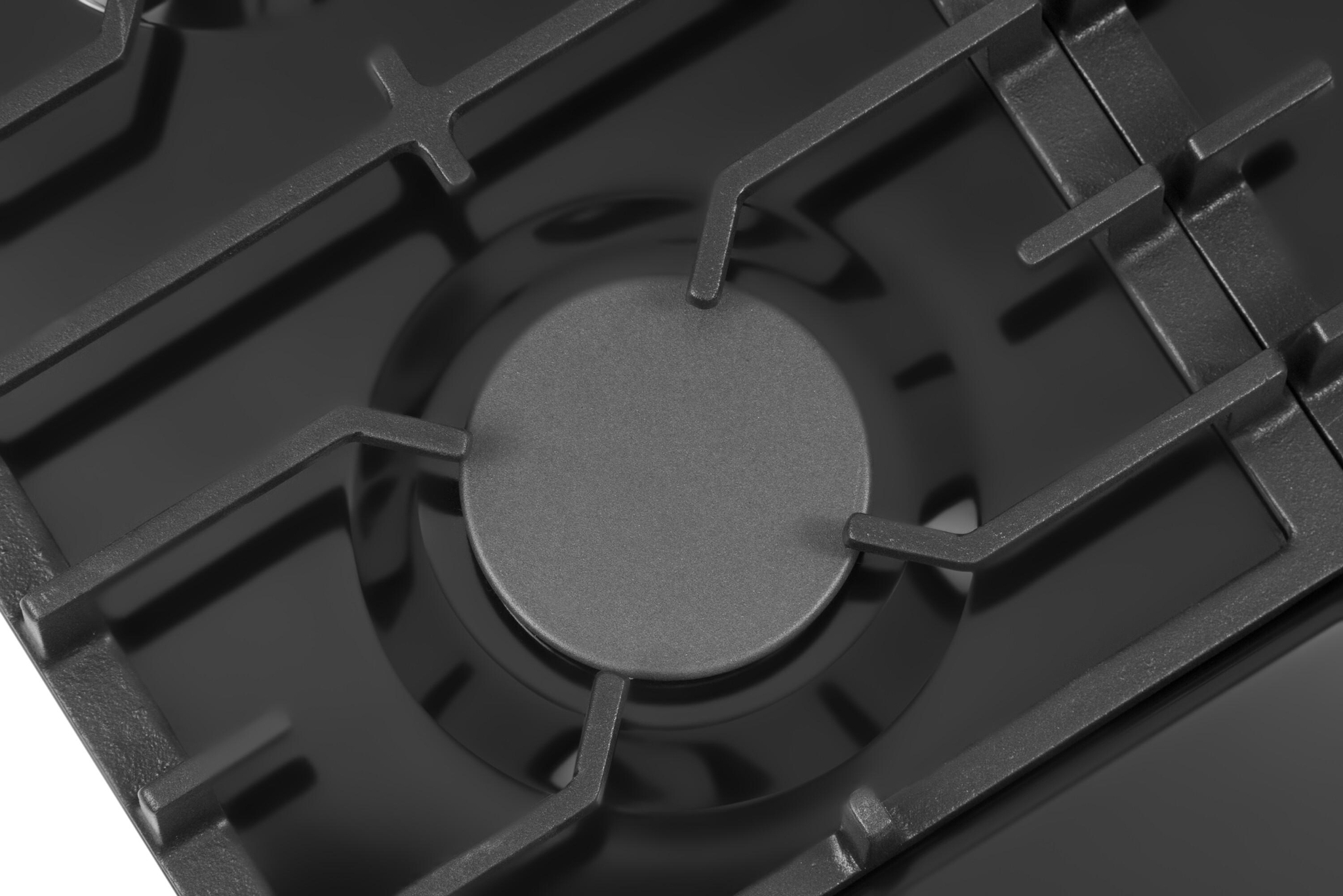 Описаниеповерхность газовая независимая, 60 см, газ на эмали, 4 конфорки, решетки чугунные, черный