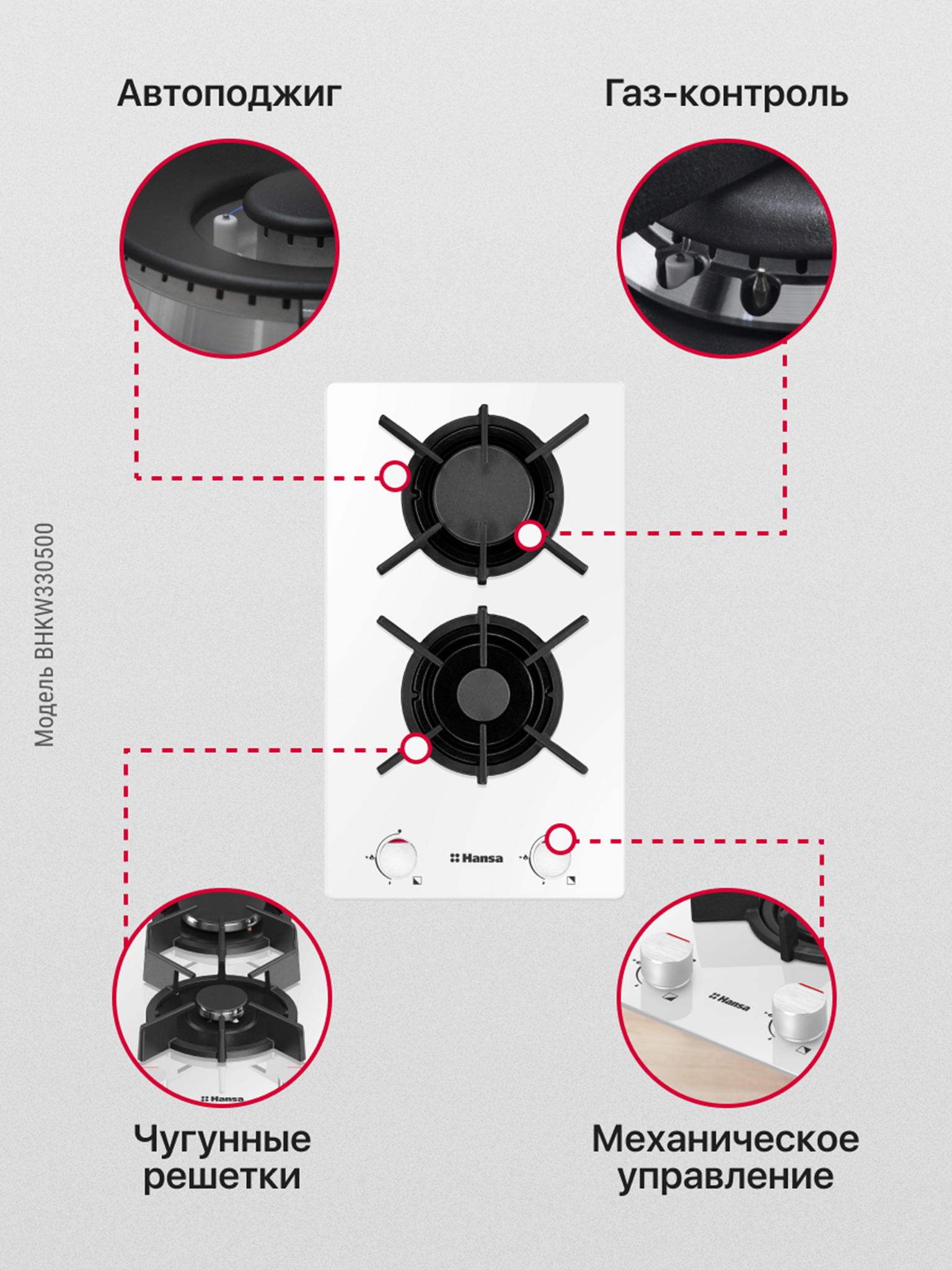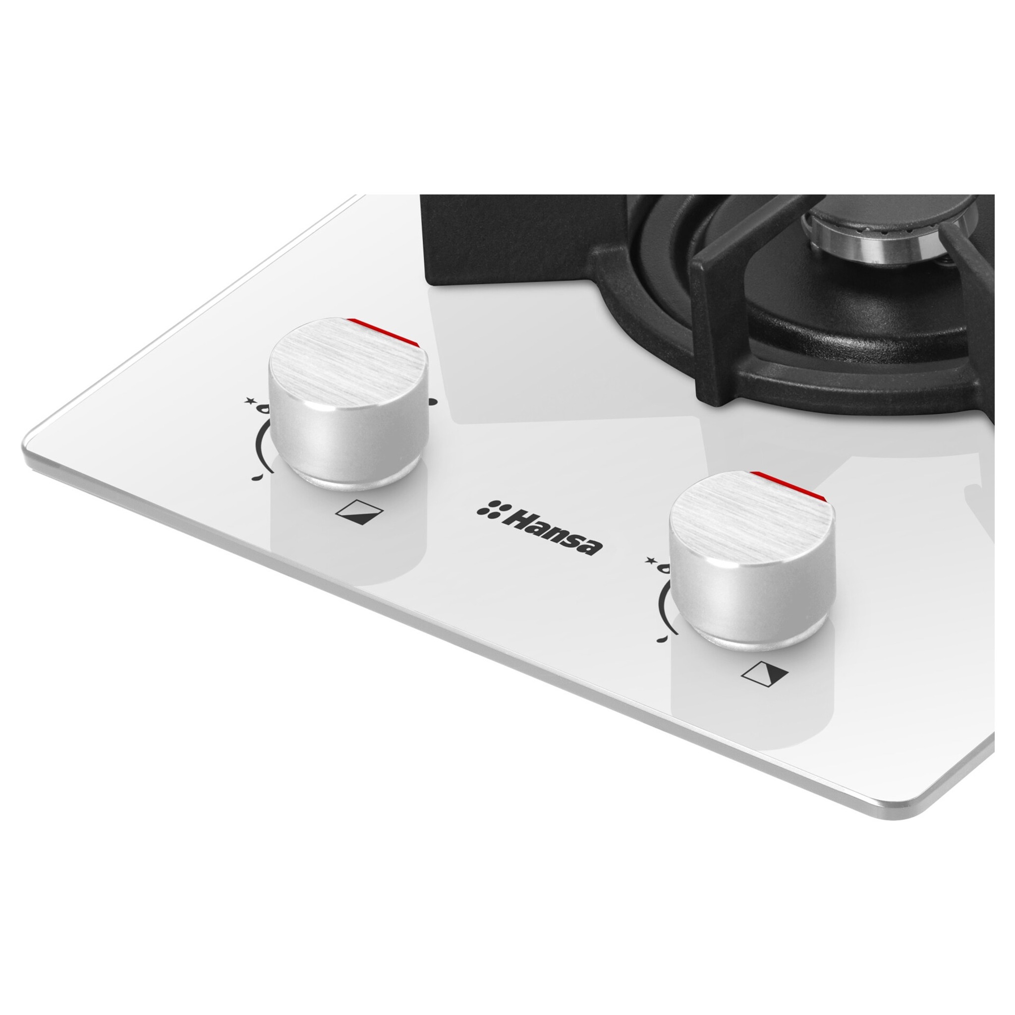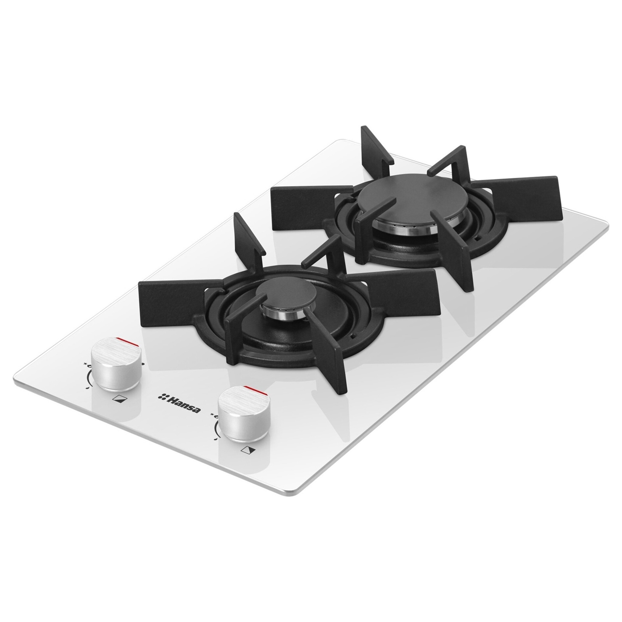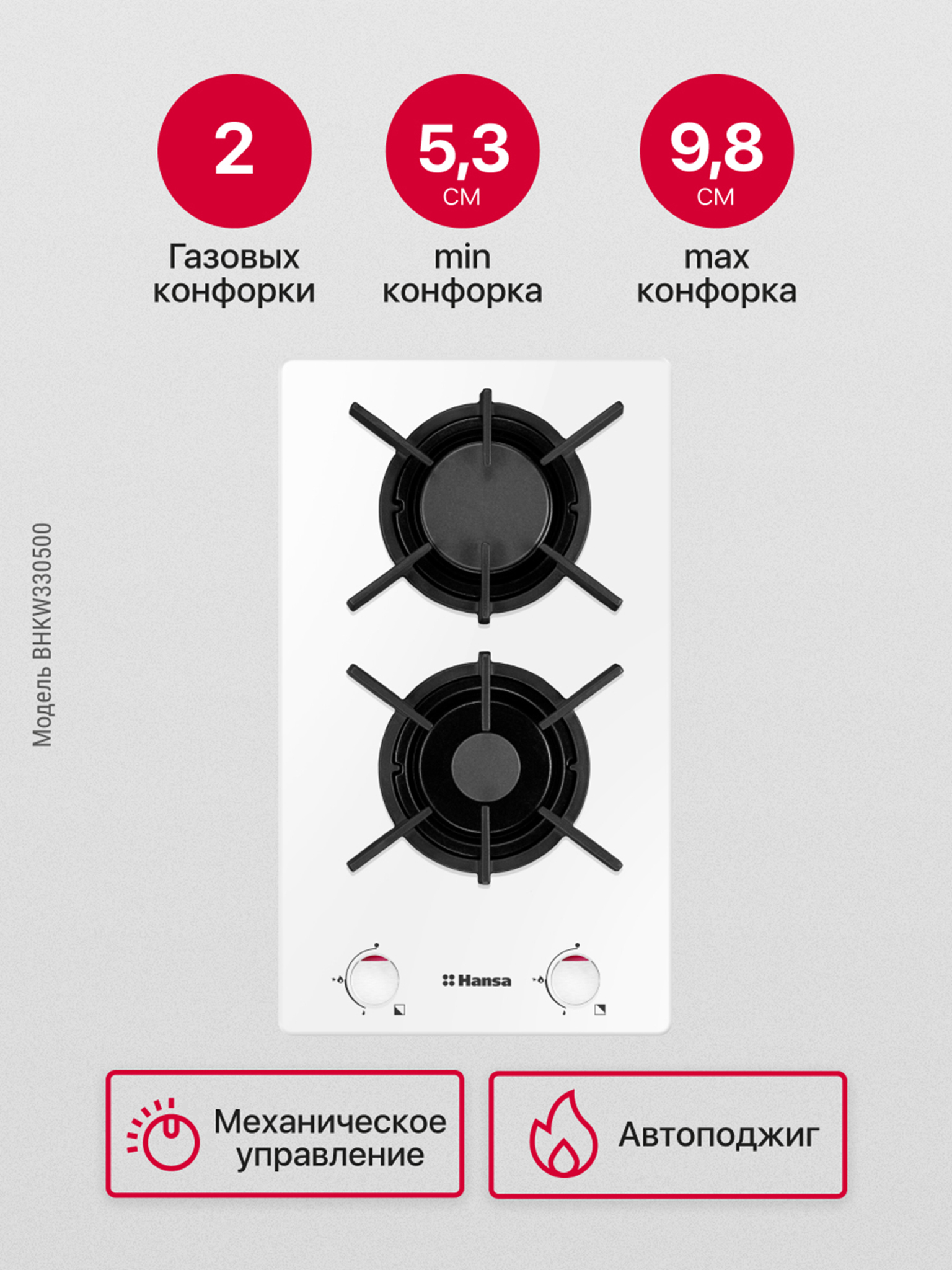 Описаниеповерхность газовая независимая, 30 см, газ на стекле, 2 конфорки, решетки чугунные, белый
