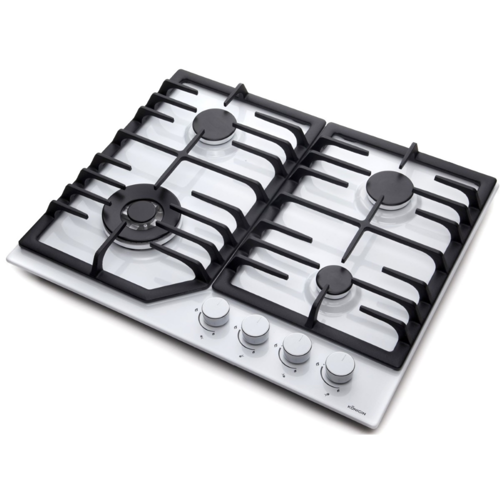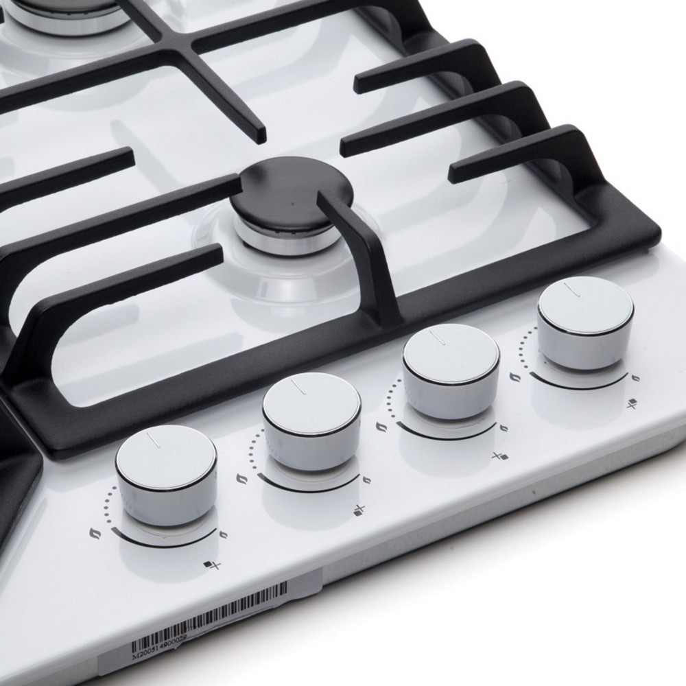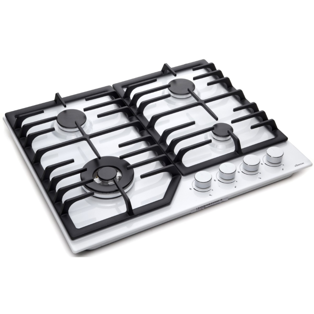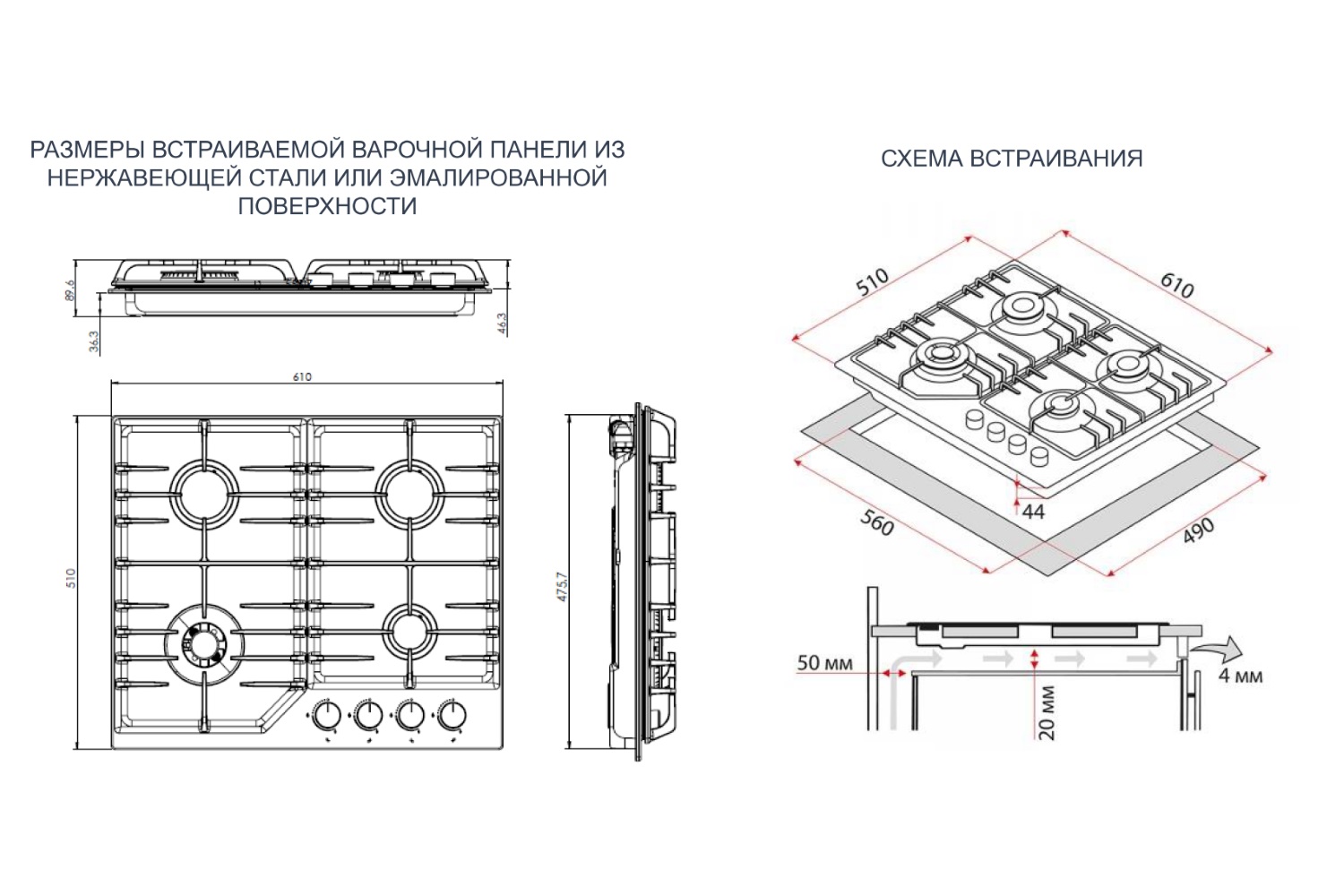 Описаниеповерхность газовая независимая, 60 см, газ на эмали, 4 конфорки, решетки чугунные, белый