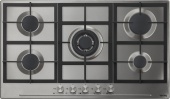 Описаниеповерхность газовая независимая, 90 см, газ на металле, 5 конфорок, решетки чугунные, нержавеющая сталь