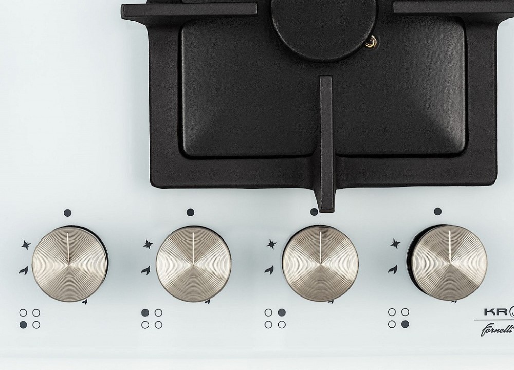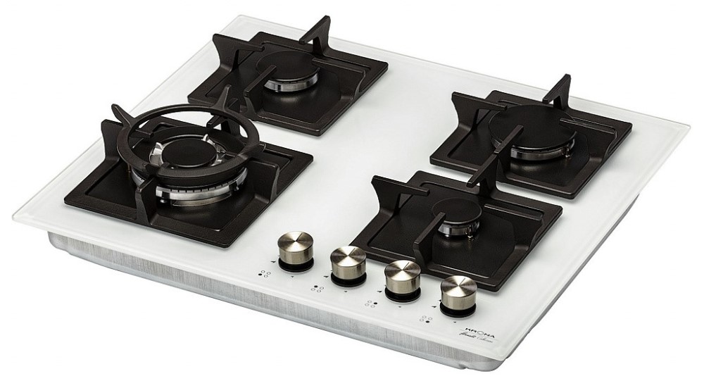 Описаниеповерхность газовая независимая, 60 см, газ на стекле, 4 конфорки, решетки чугунные, белый