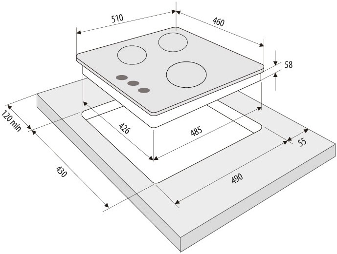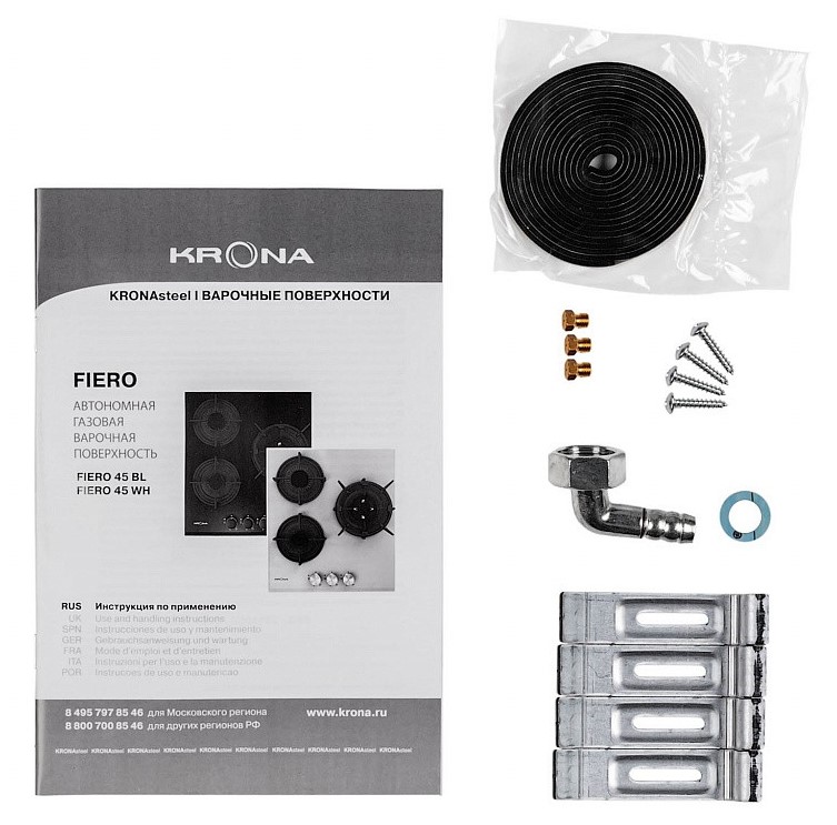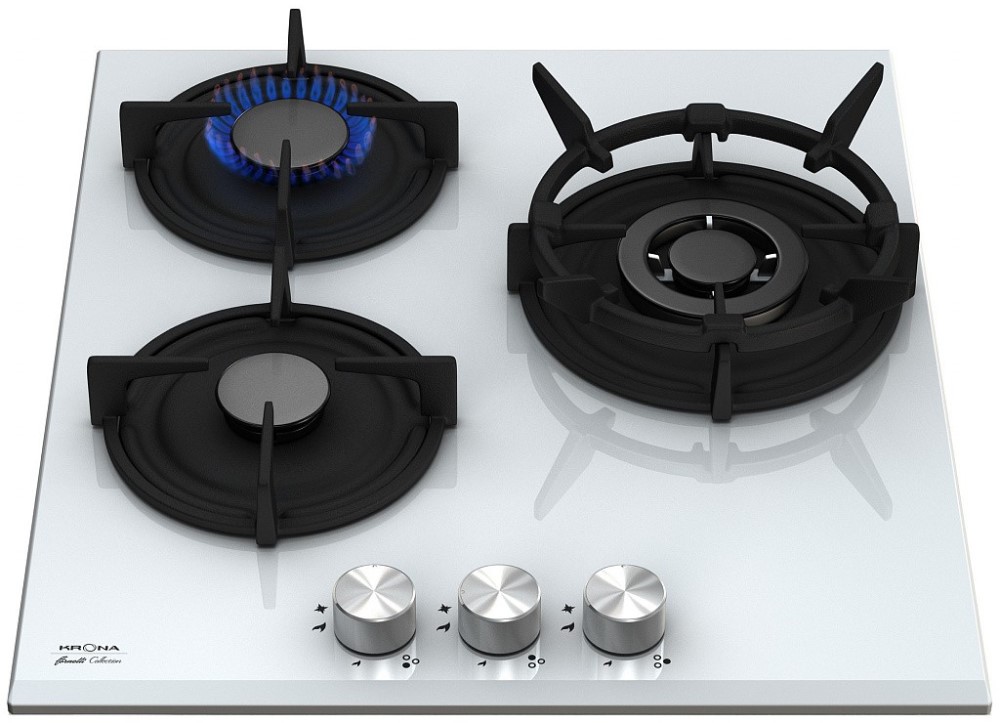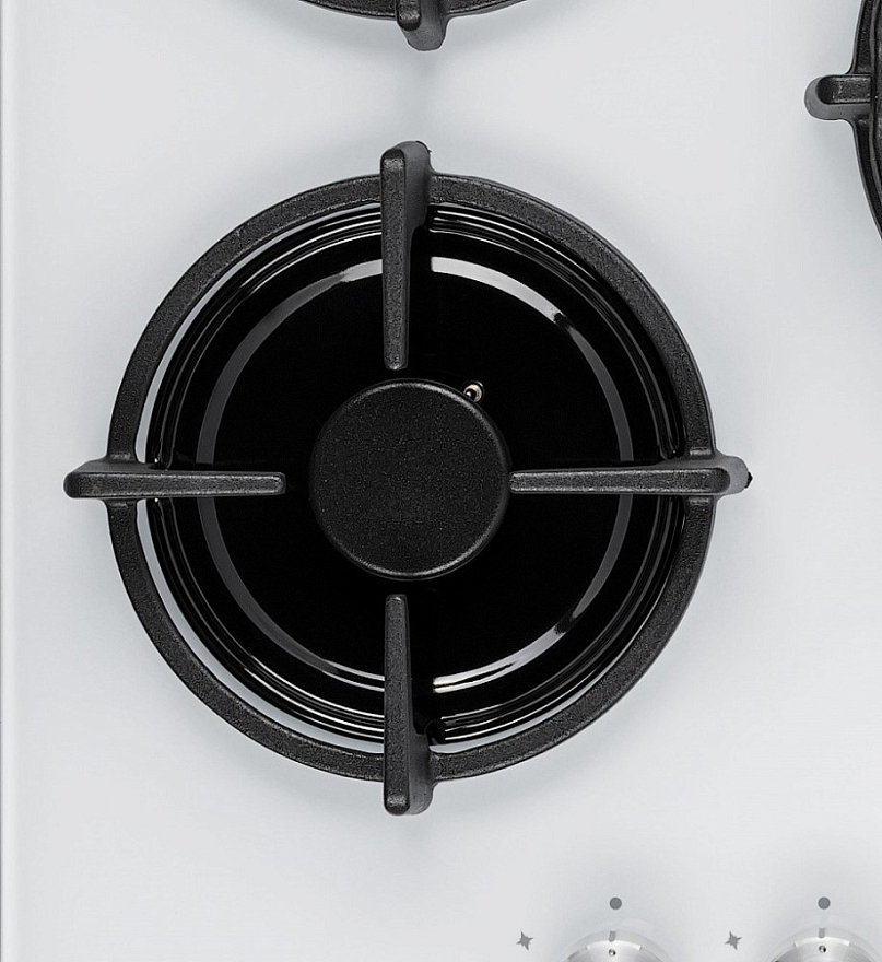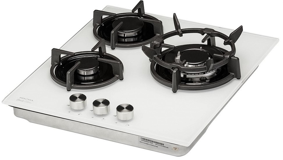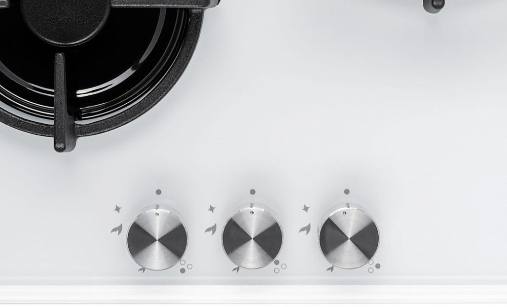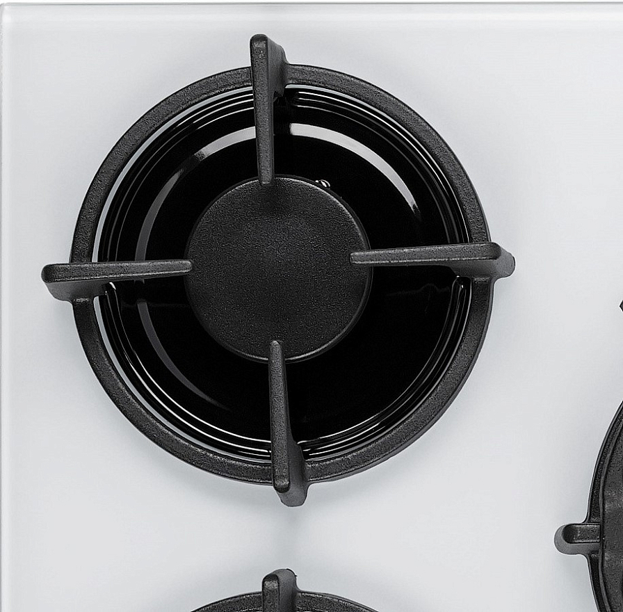 Описаниеповерхность газовая независимая, 45 см, газ на стекле, 3 конфорки, решетки чугунные, белый, скошенный передний край