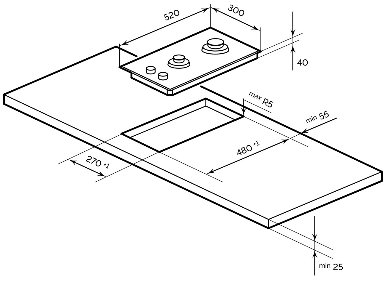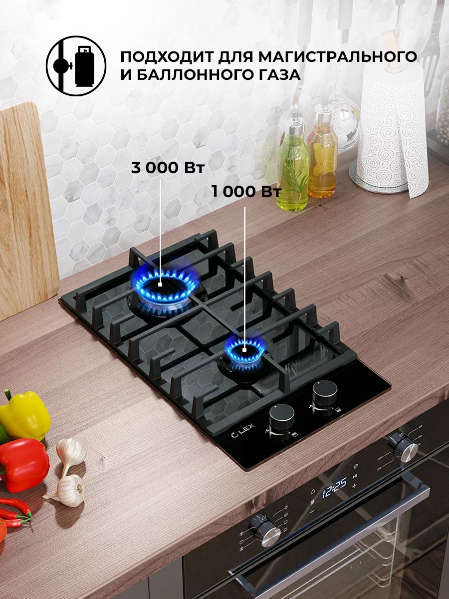 Описаниеповерхность газовая независимая, 30 см, газ на стекле, 2 конфорки, решетки чугунные, черный