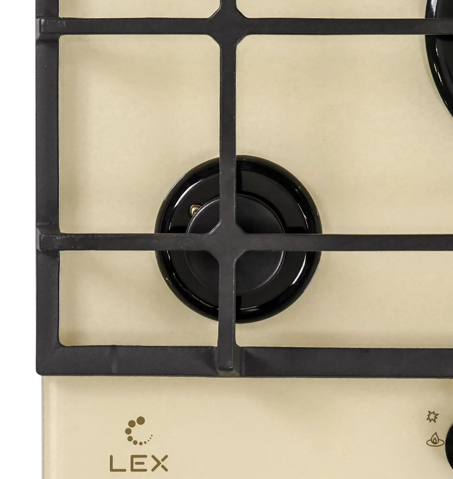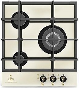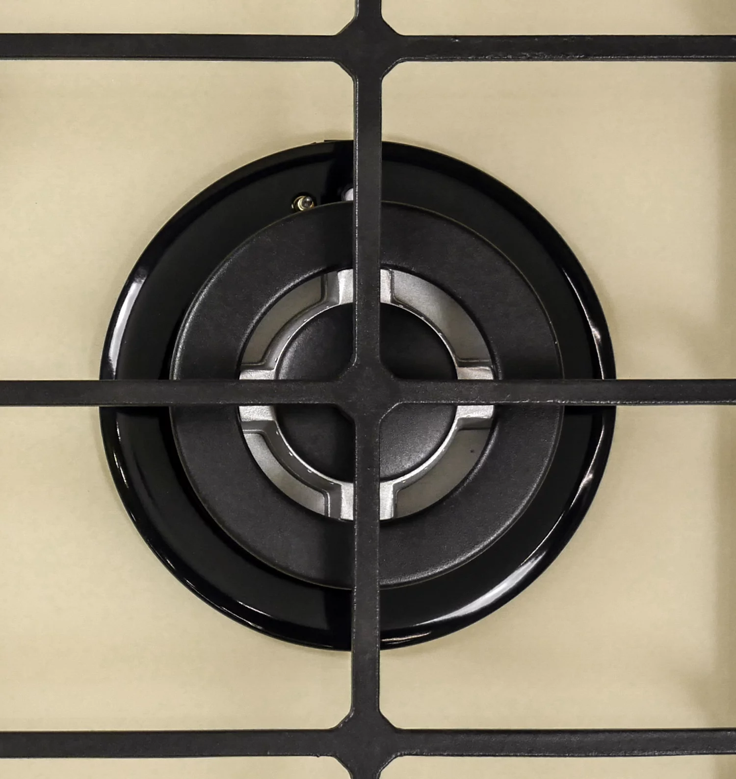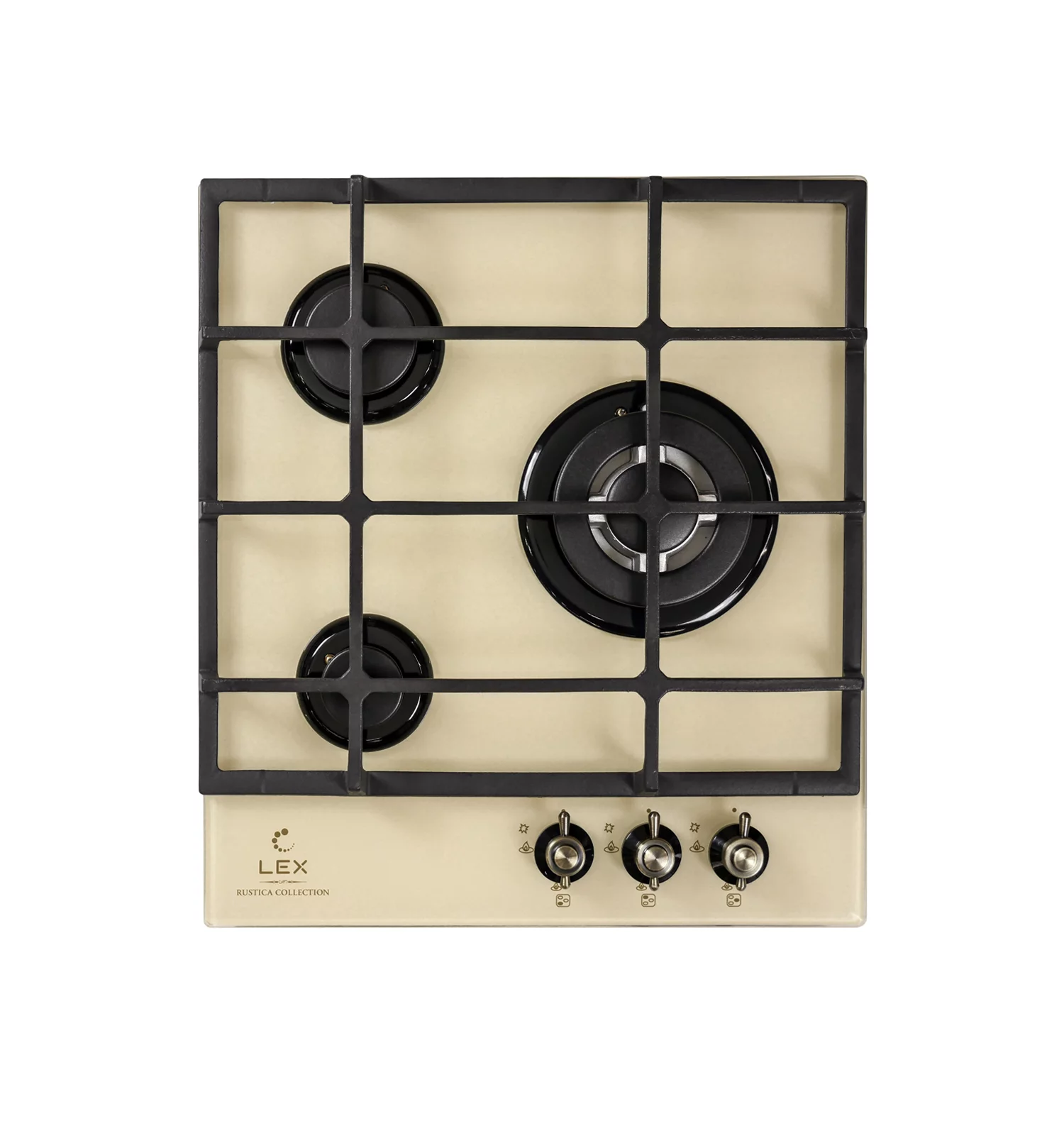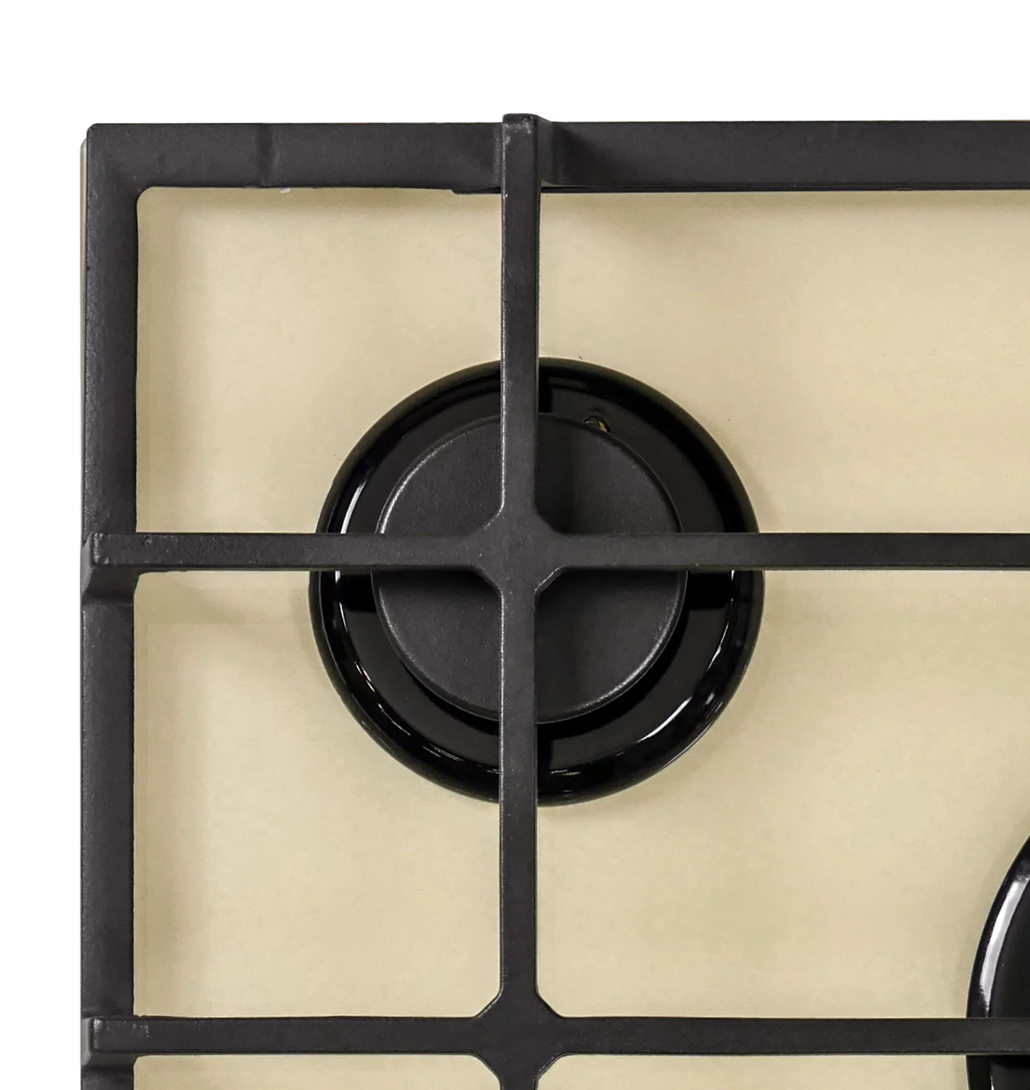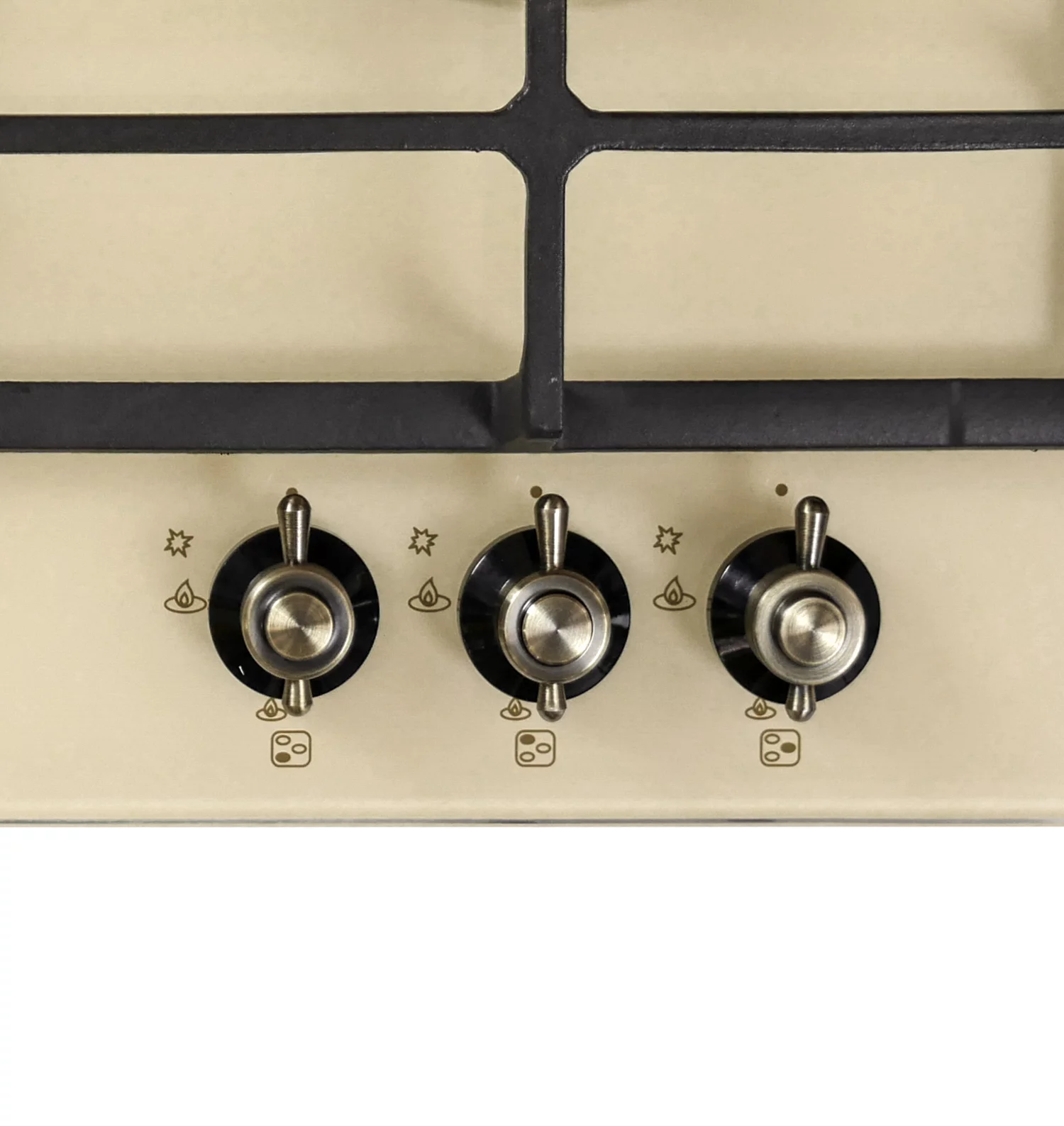 Описаниеповерхность газовая независимая, 45 см, газ на стекле, 3 конфорки, решетки чугунные, слоновая кость/латунь