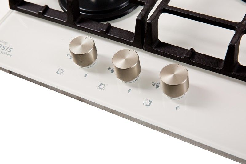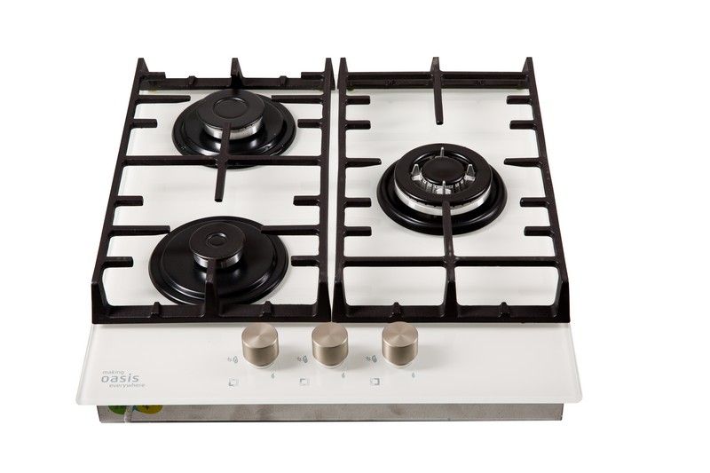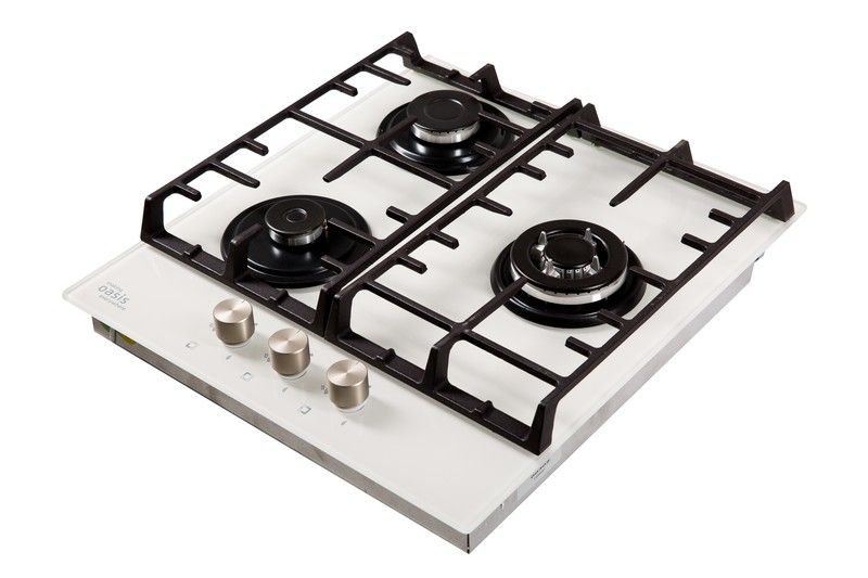 Описаниеповерхность газовая независимая, 45 см, газ на стекле, 3 конфорки, решетки чугунные, белый