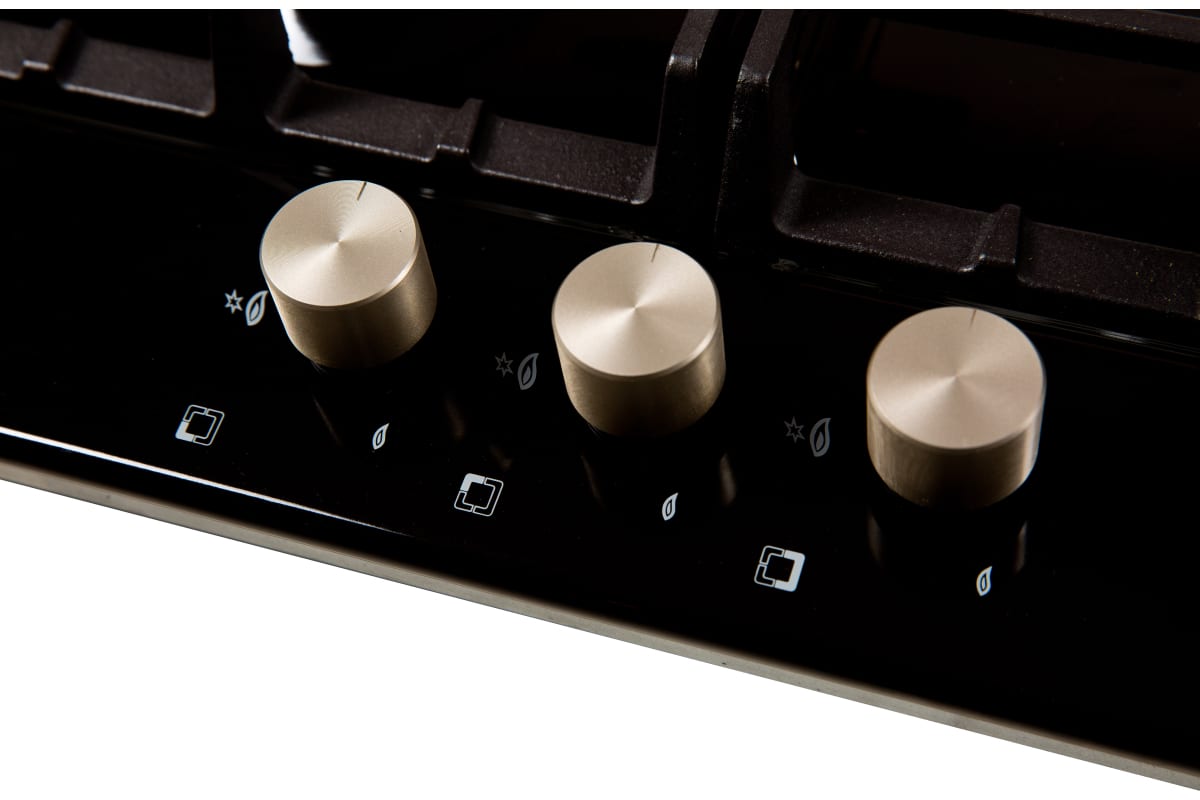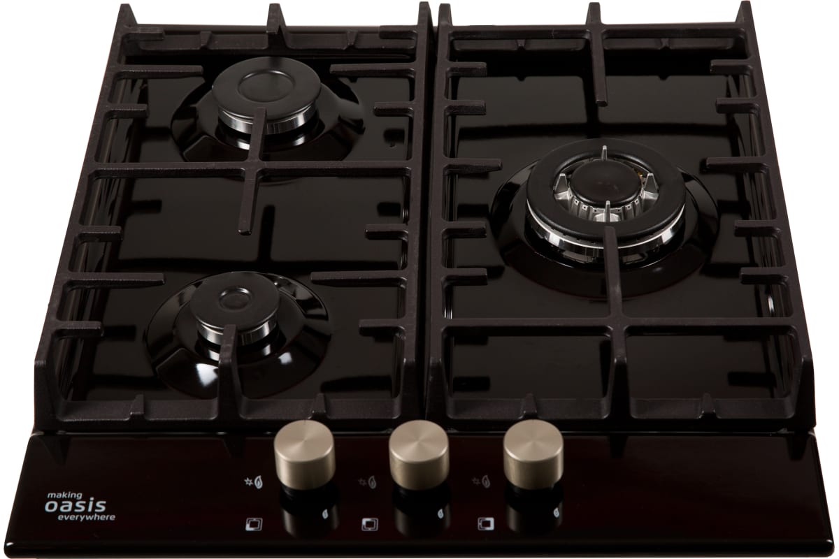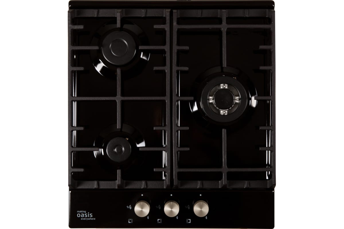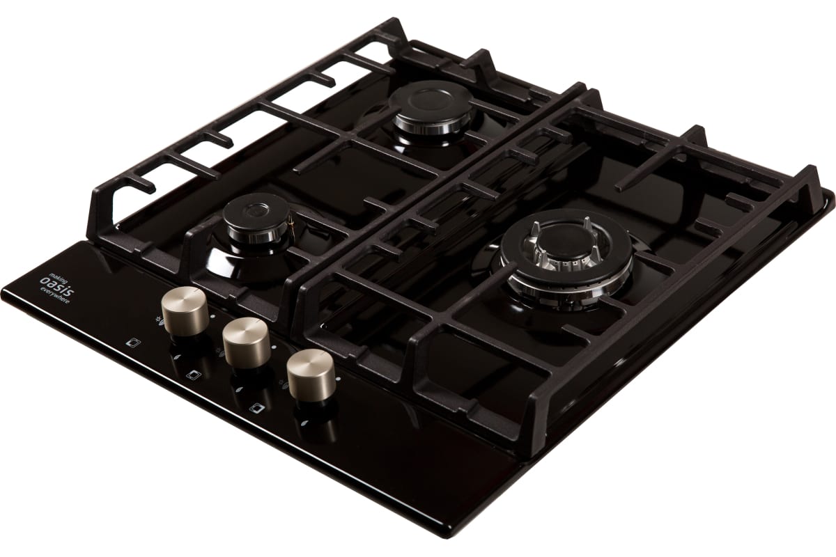 Описаниеповерхность газовая независимая, 45 см, газ на эмали, 3 конфорки, решетки чугунные, черный
