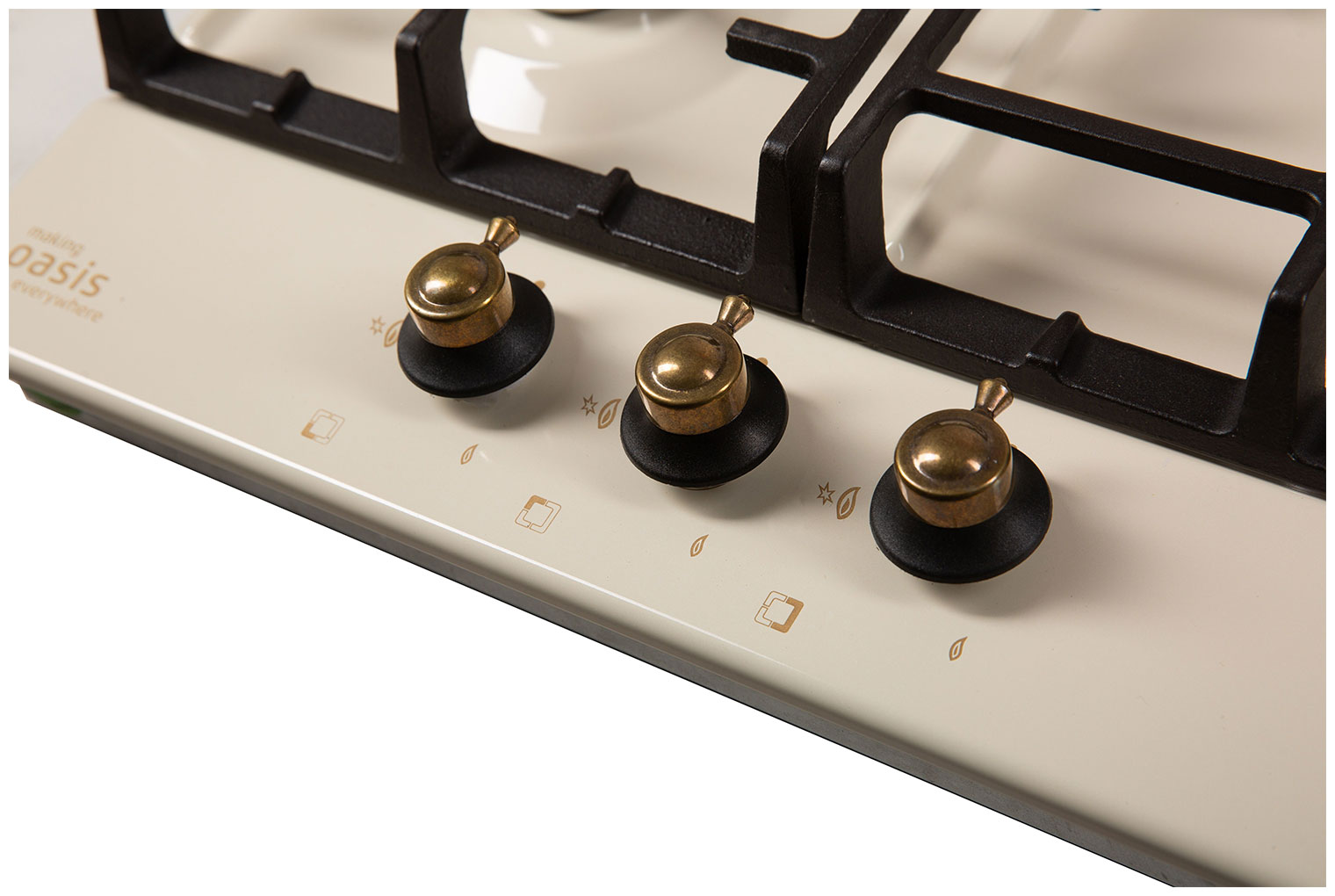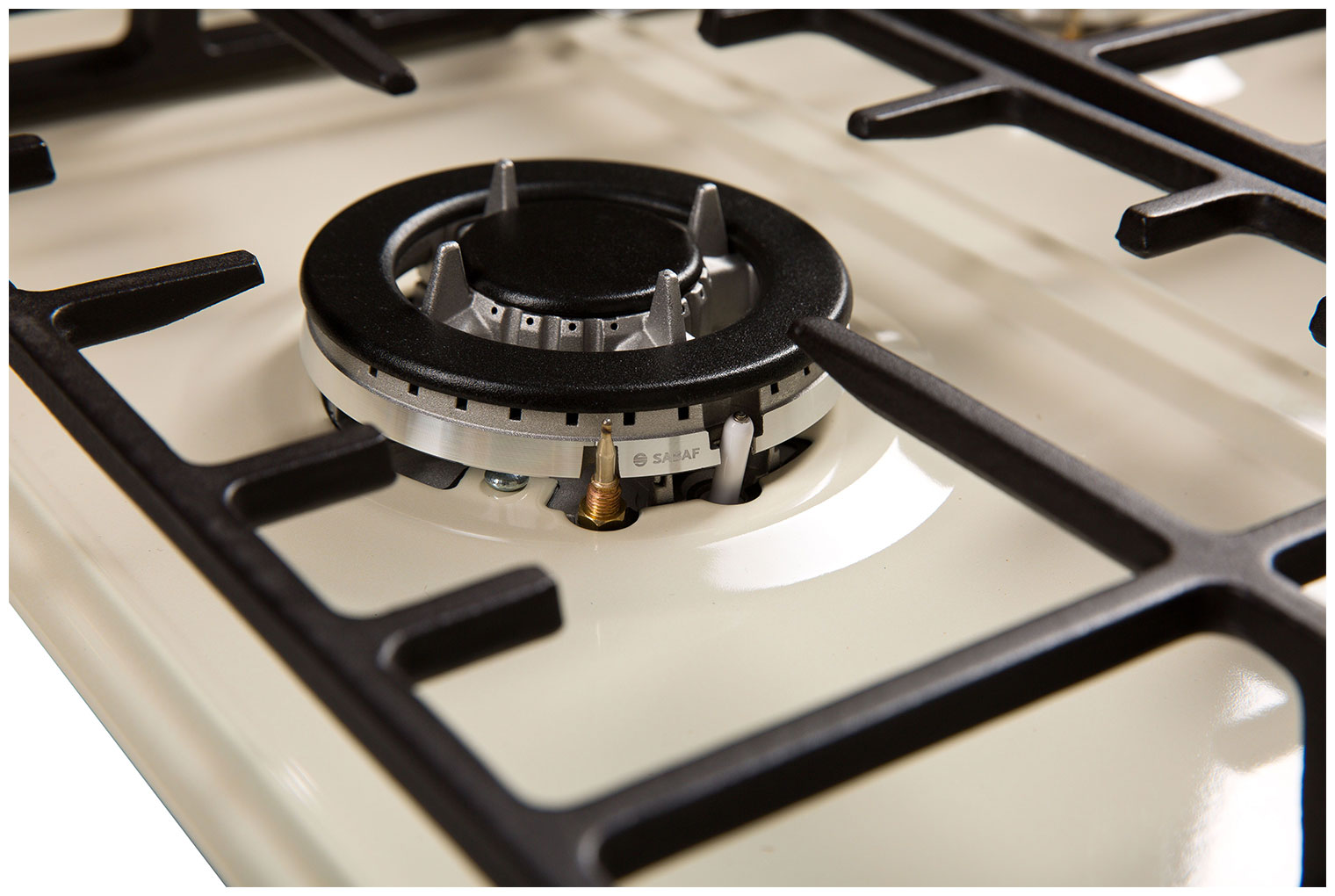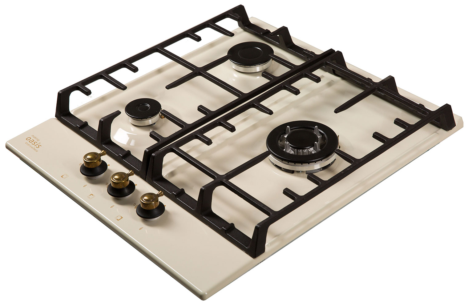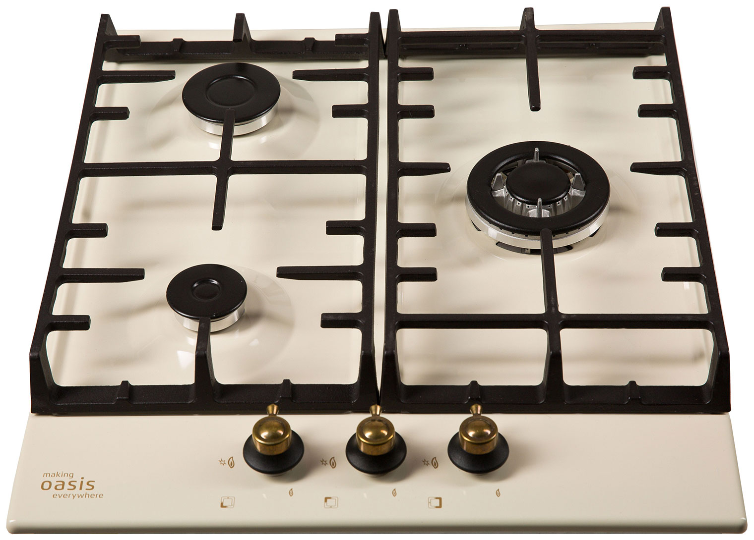 Описаниеповерхность газовая независимая, 45 см, газ на эмали, 3 конфорки, решетки чугунные, бежевый