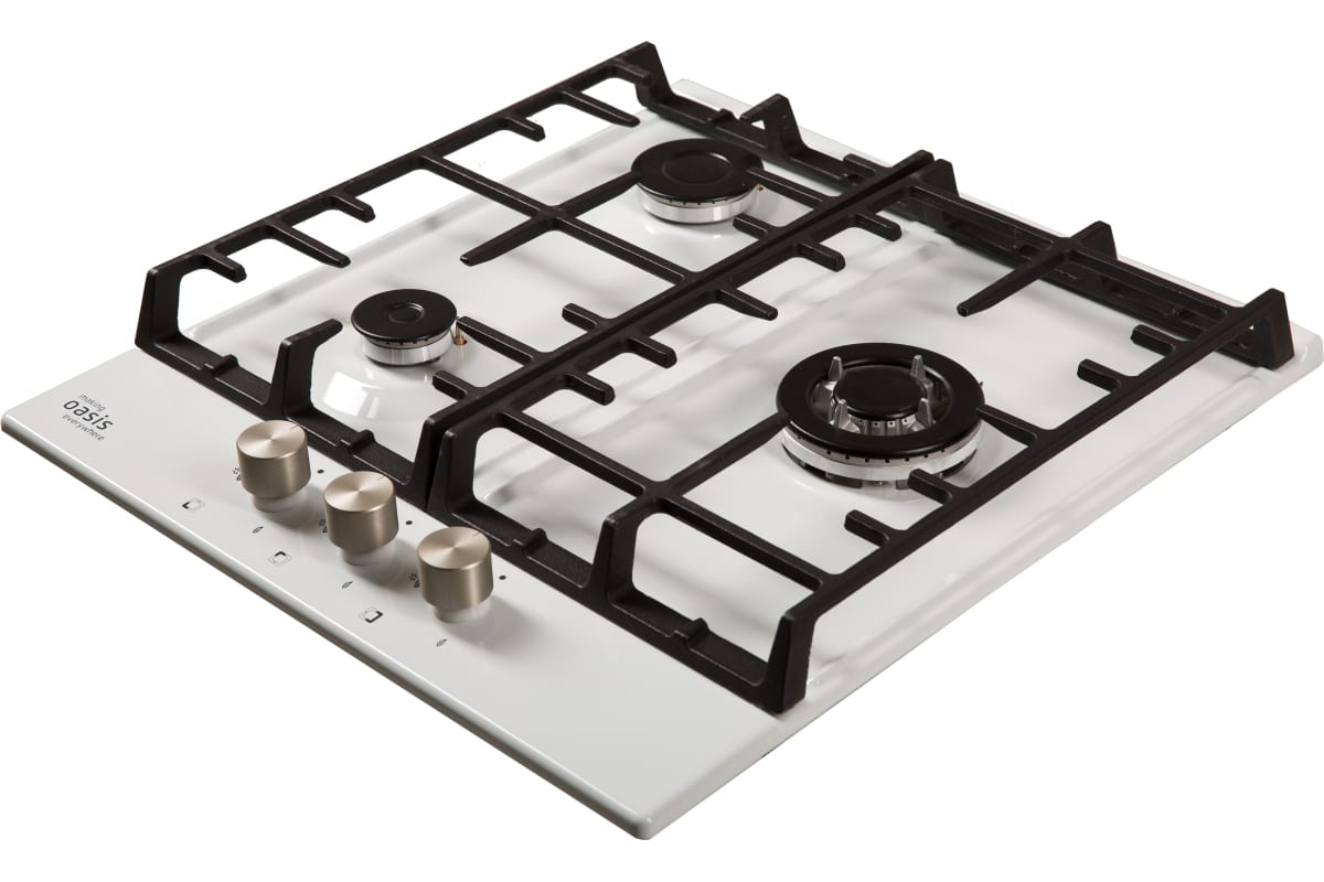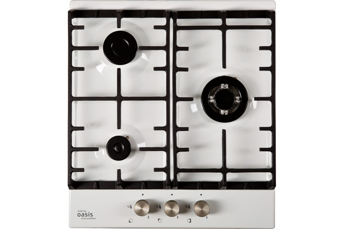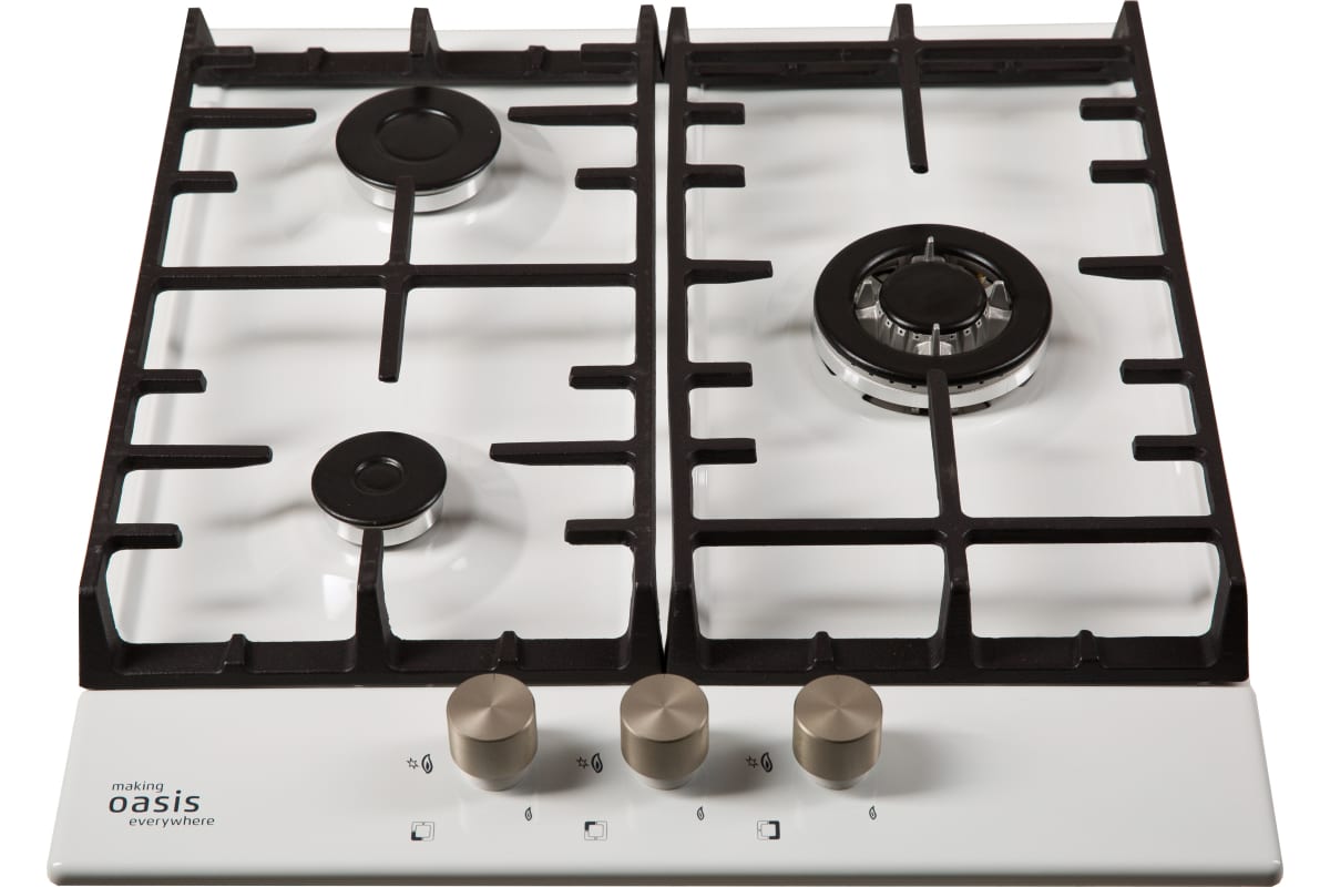 Описаниеповерхность газовая независимая, 45 см, газ на эмали, 3 конфорки, решетки чугунные, белый