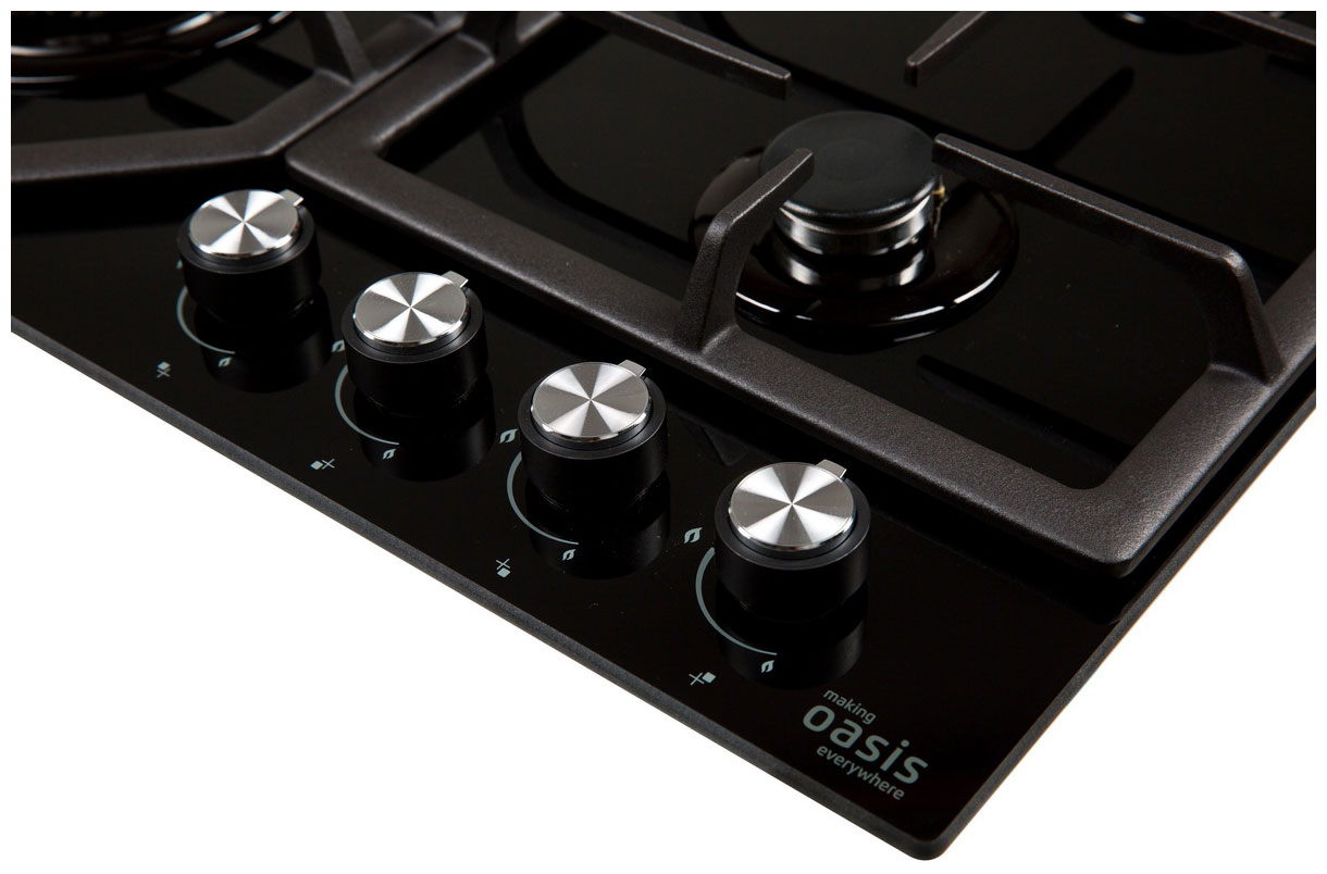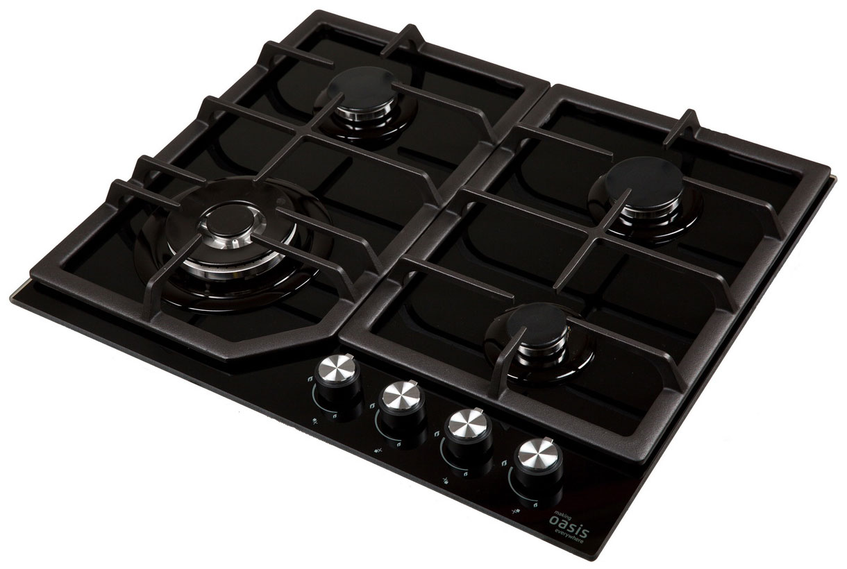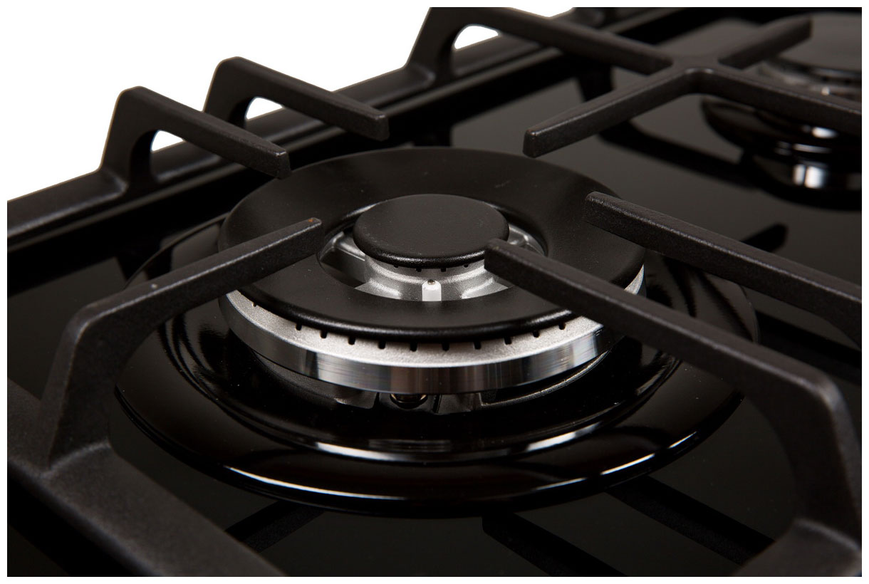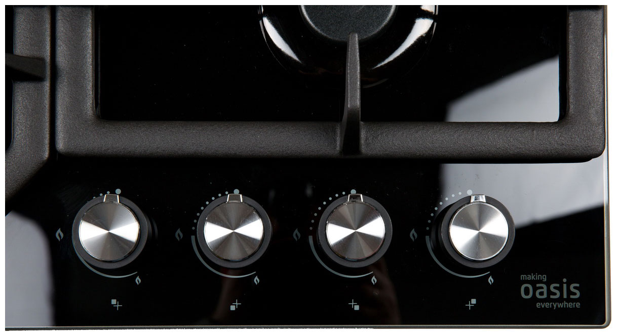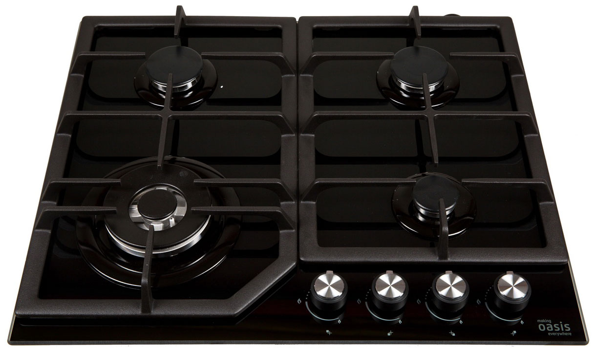 Описаниеповерхность газовая независимая, 60 см, газ на стекле, 4 конфорки, решетки чугунные, черный