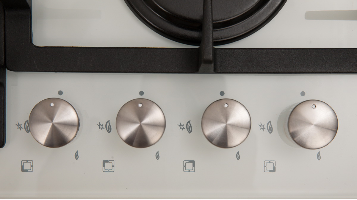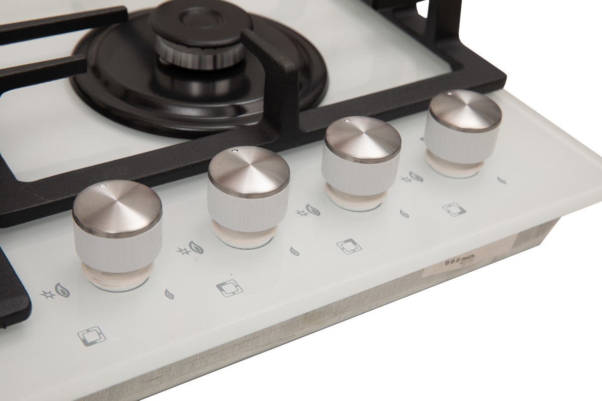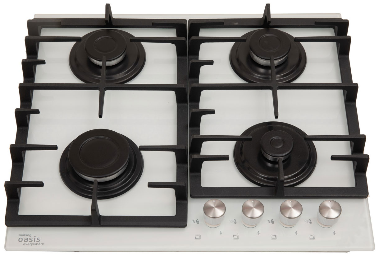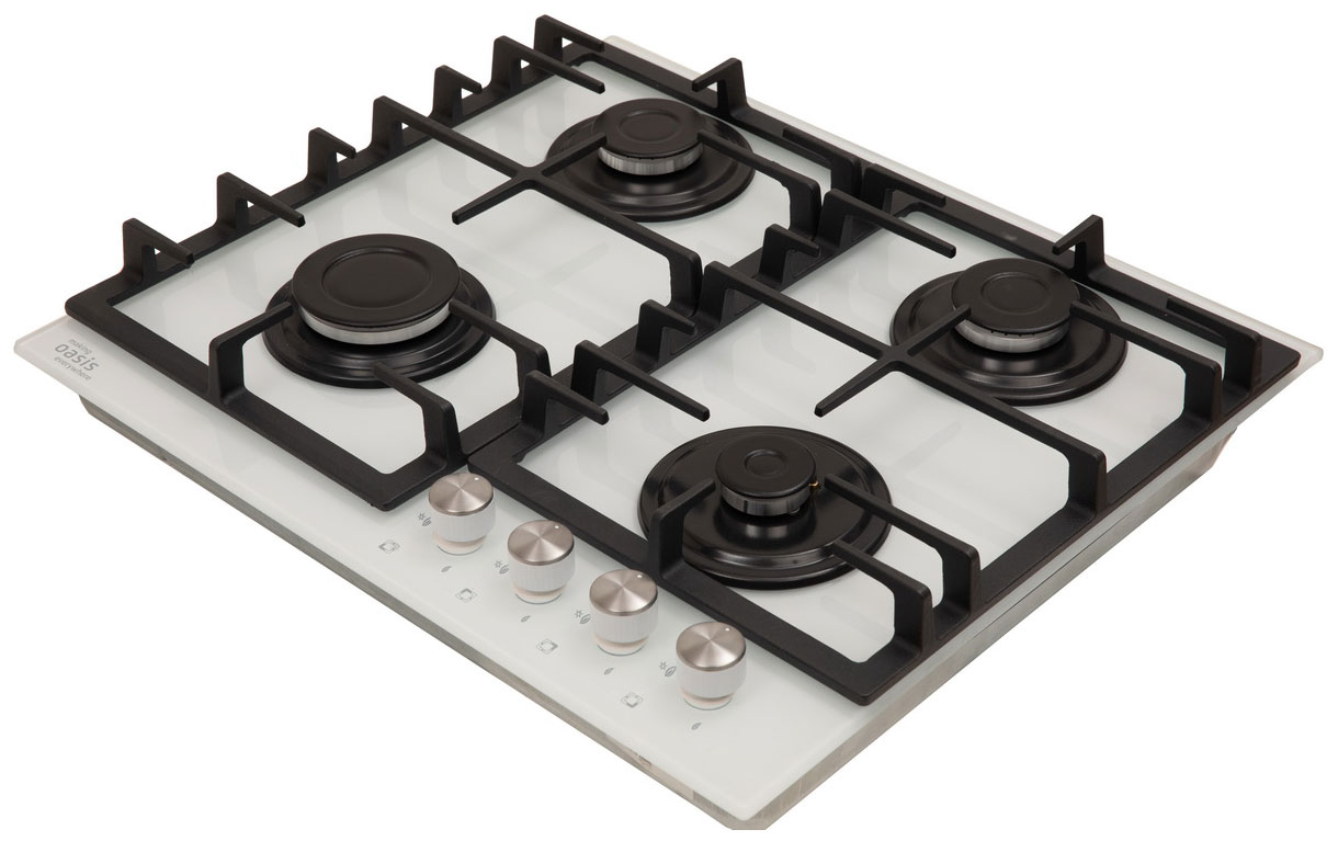 Описаниеповерхность газовая независимая, 60 см, газ на стекле, 4 конфорки, решетки чугунные, белый
