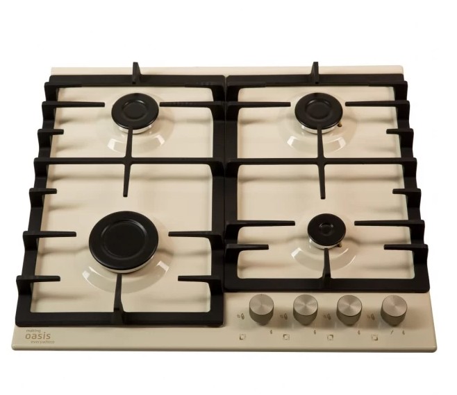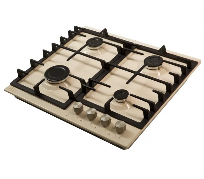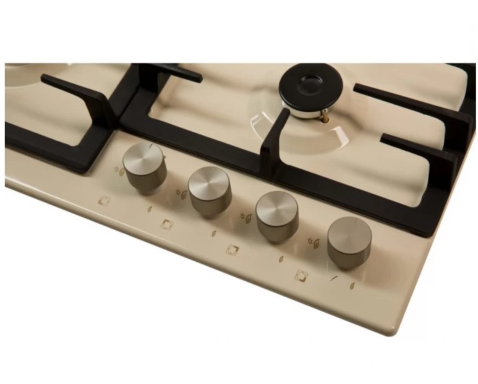 Описаниеповерхность газовая независимая, 60 см, газ на эмали, 4 конфорки, решетки чугунные, бежевый