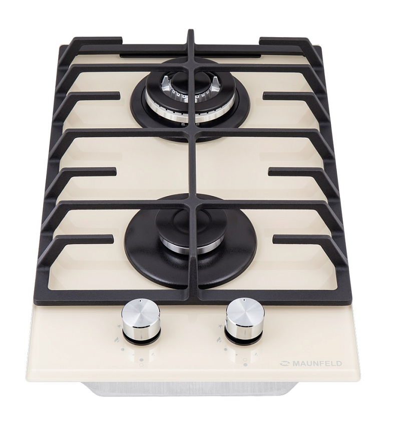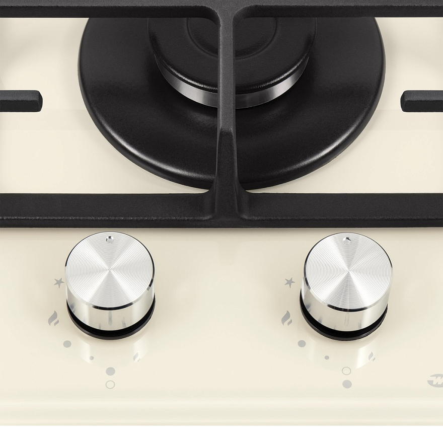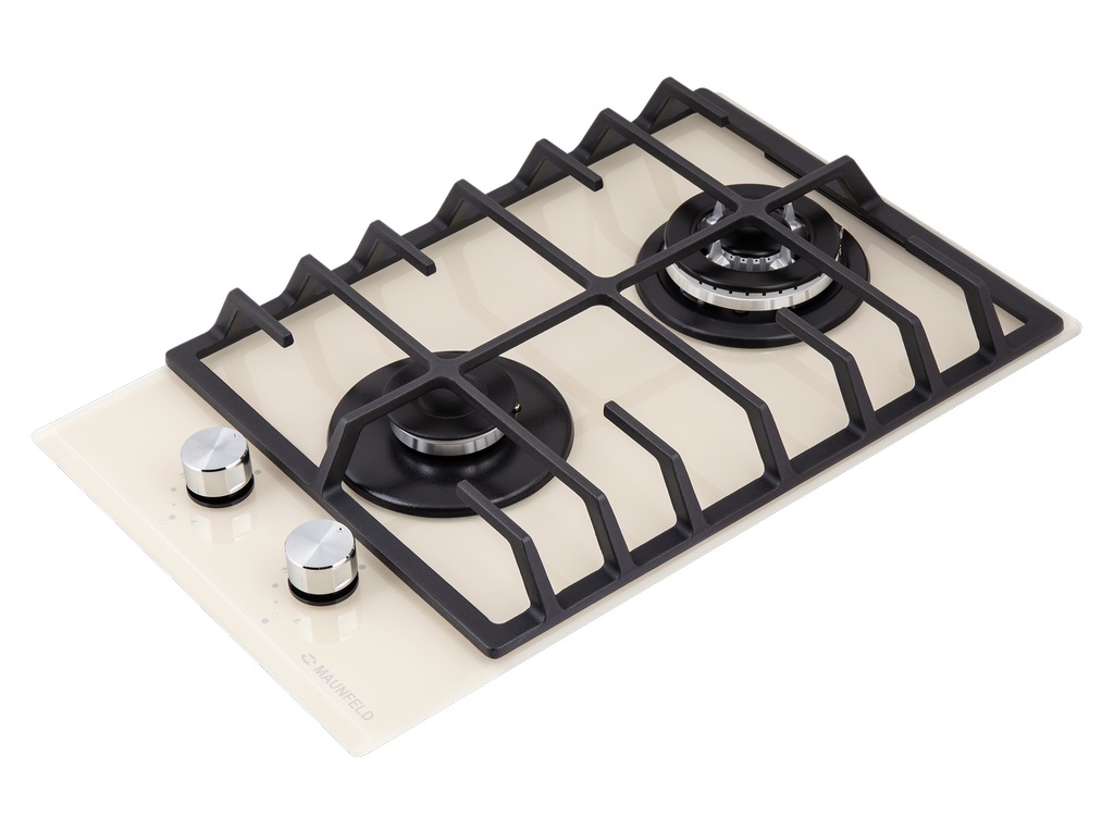 Описаниеповерхность газовая независимая, 30 см, газ на стекле, 2 конфорки, чугунные решетки, бежевый