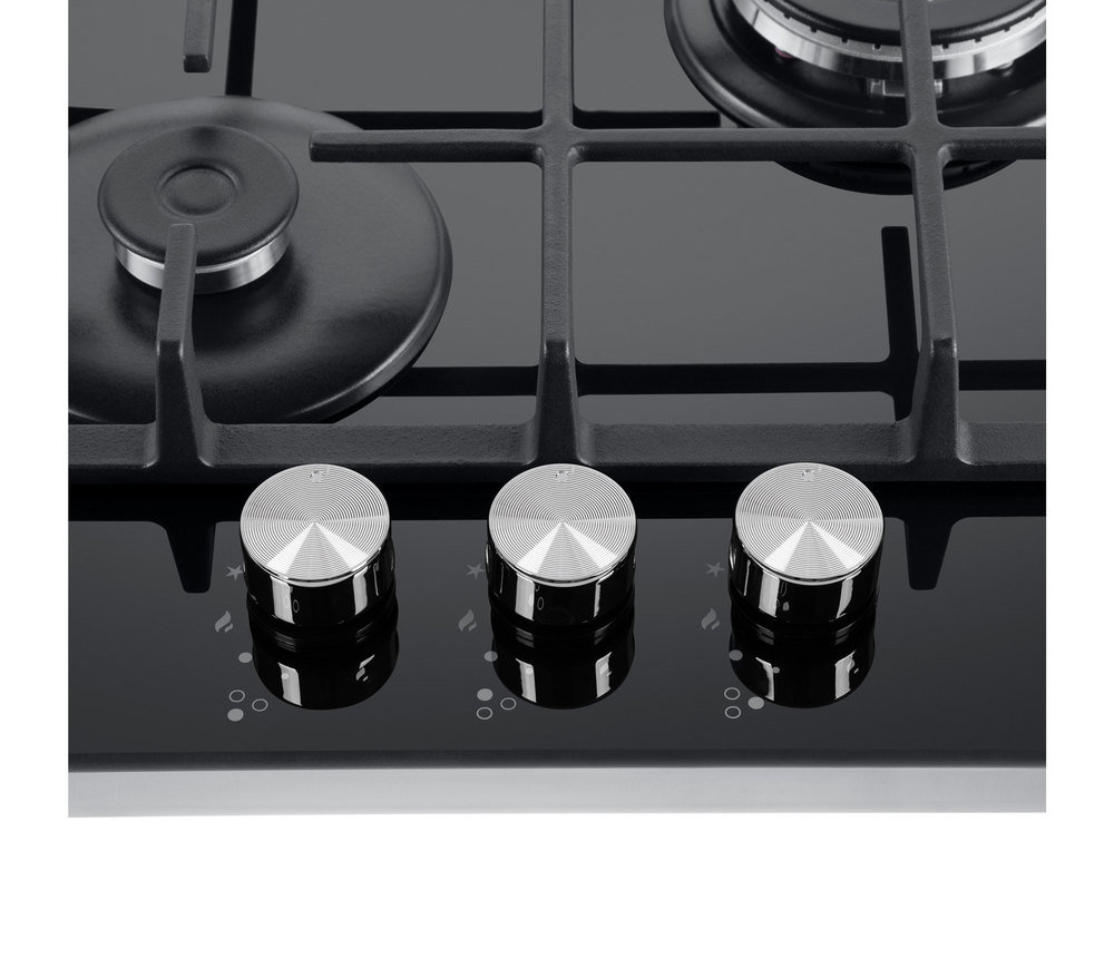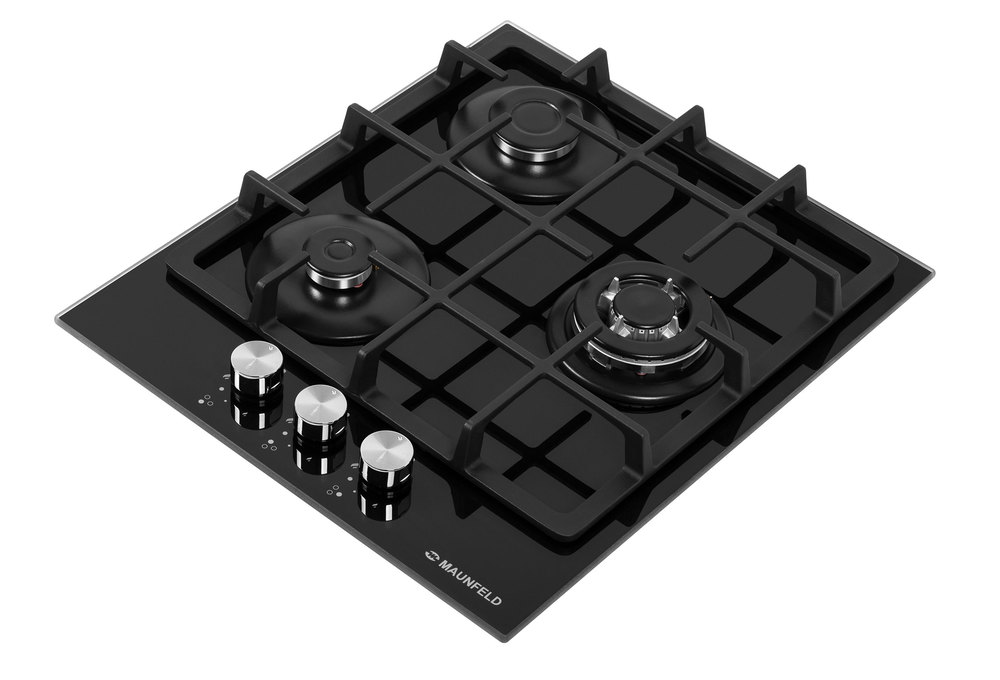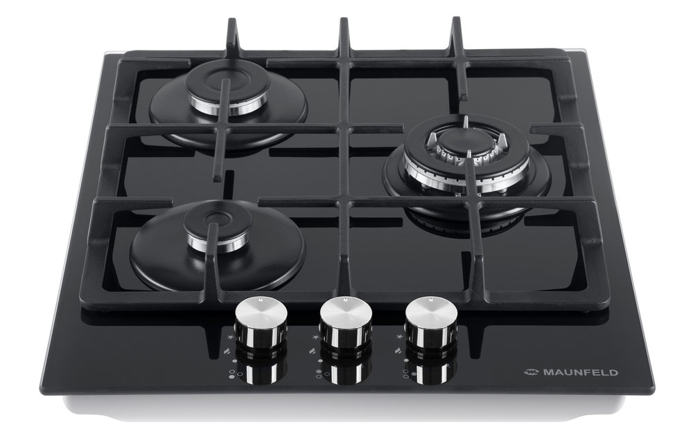 Описаниеповерхность газовая независимая, 45 см, газ на стекле, 3 конфорки, чугунные решетки, черный