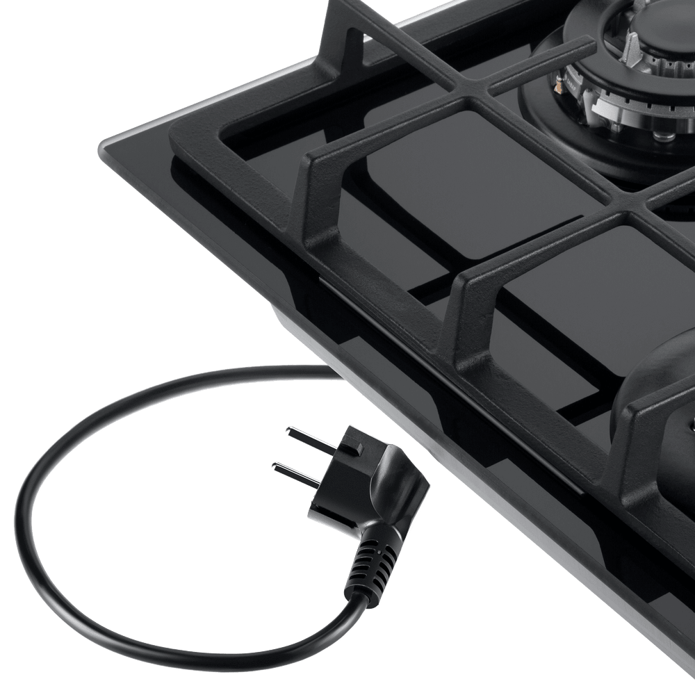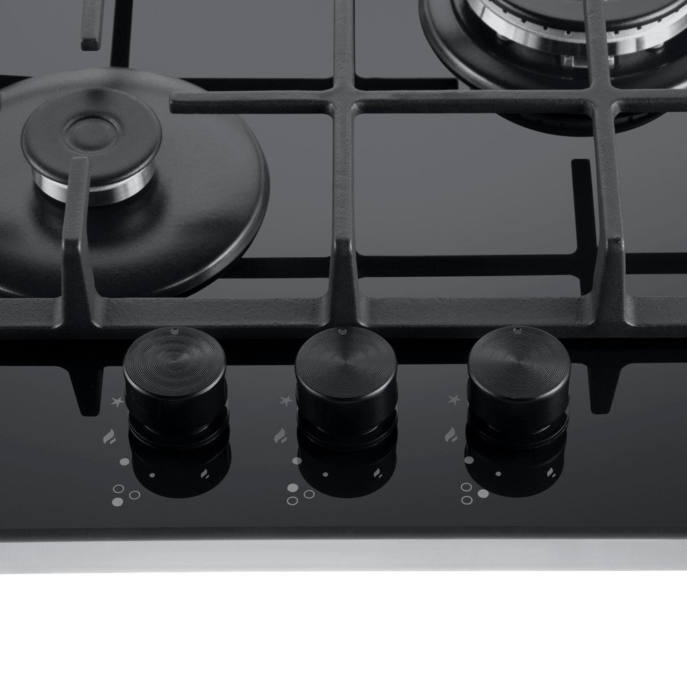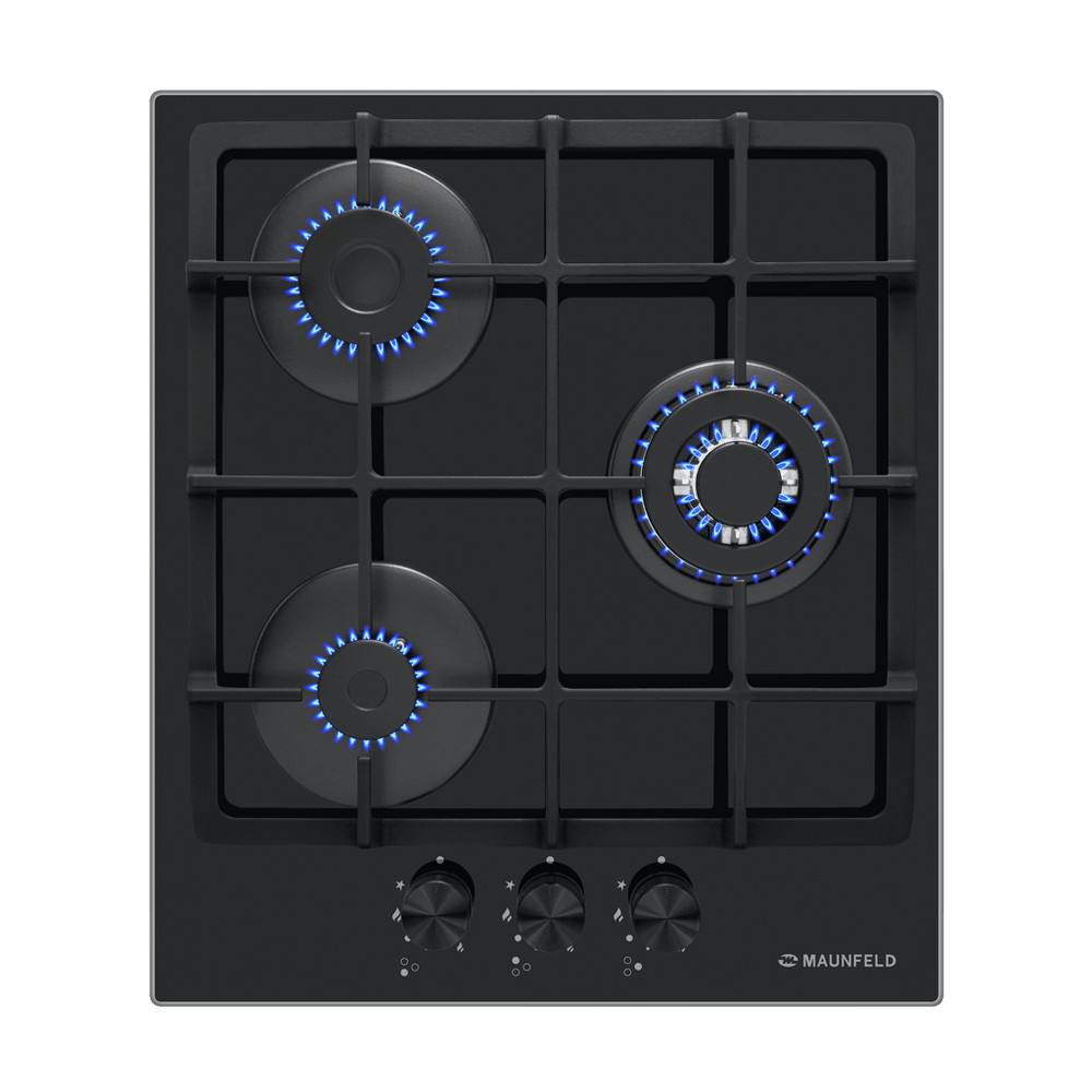 Описаниеповерхность газовая независимая, 45 см, газ на стекле, 3 конфорки, чугунные решетки, черный