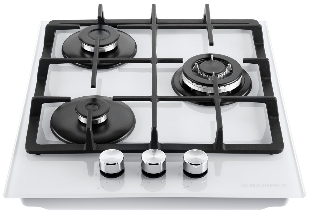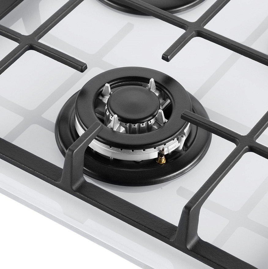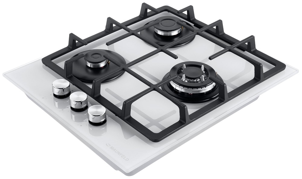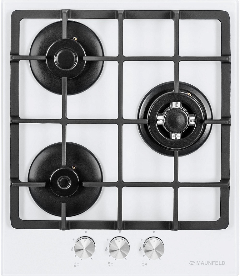 Описаниеповерхность газовая независимая, 45 см, газ на стекле, 3 конфорки, чугунные решетки, белый