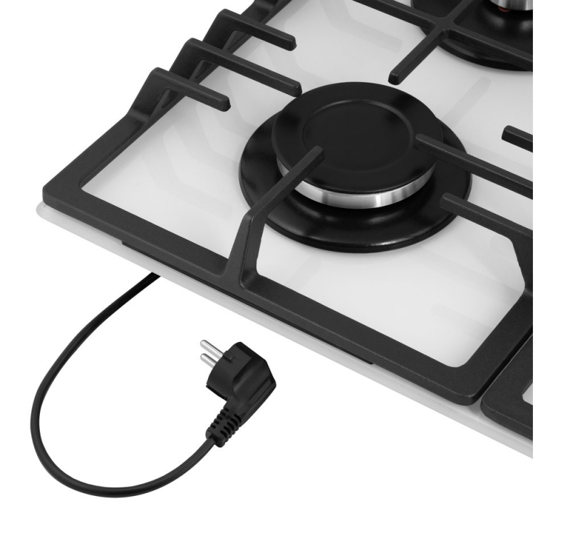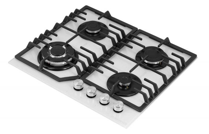 Описаниеповерхность газовая независимая, 60 см, газ на стекле, 4 конфорки, решетки чугунные, белый