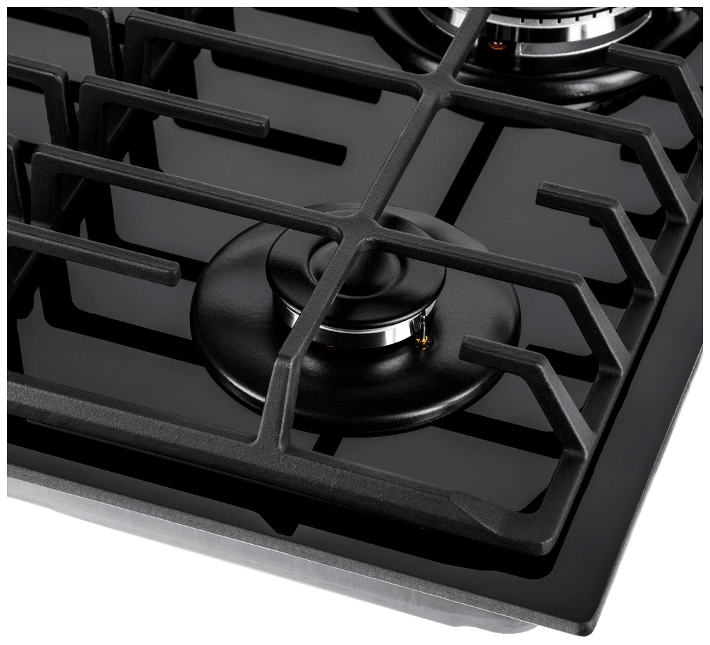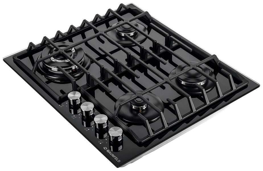 Описаниеповерхность газовая независимая, 60 см, газ на стекле, 4 конфорки, чугунные решетки, черный
