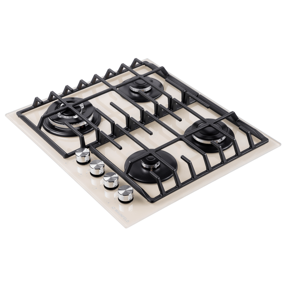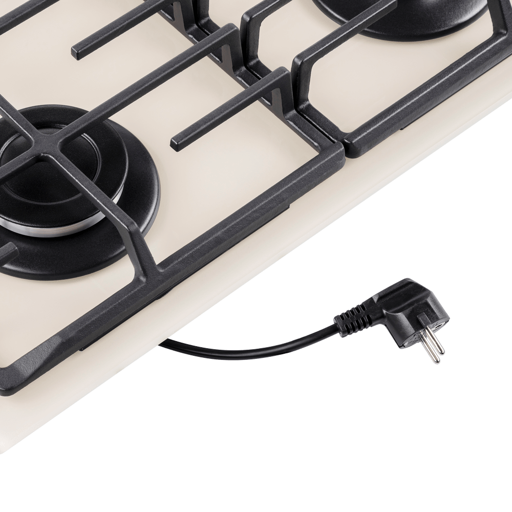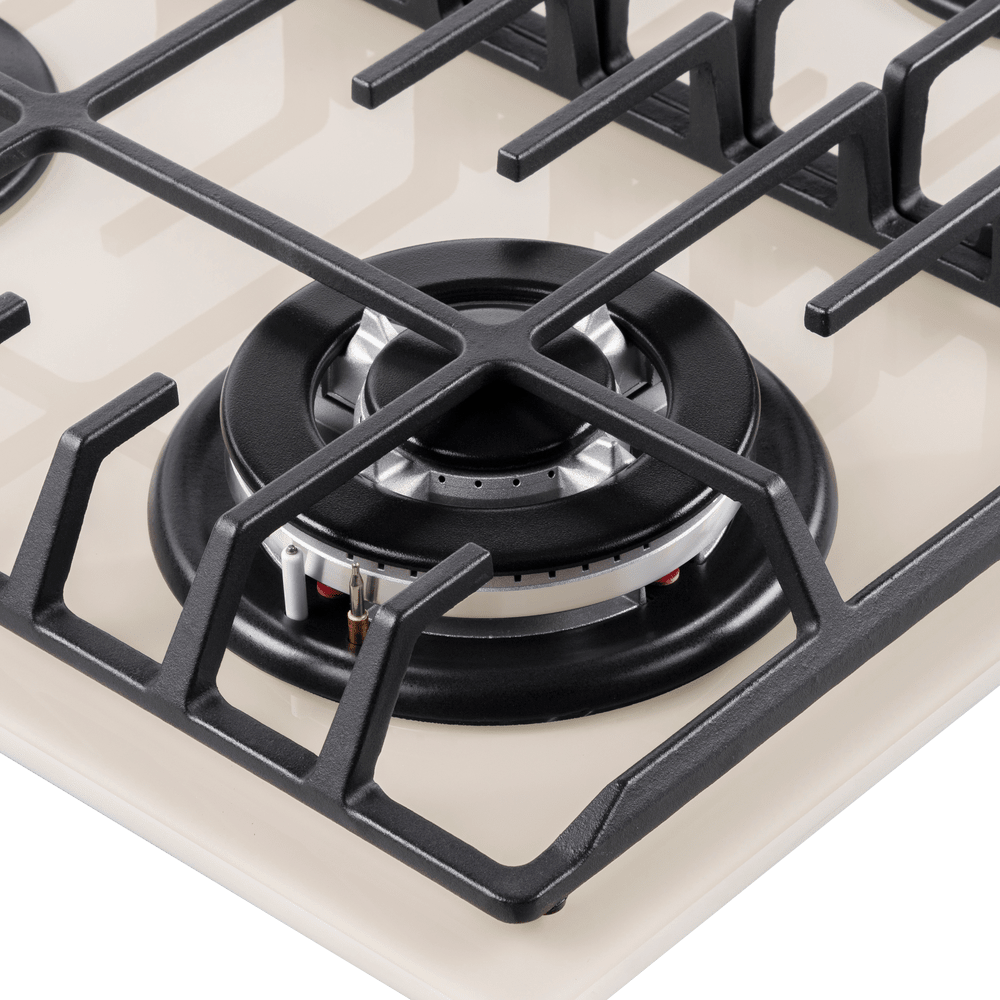 Описаниеповерхность газовая независимая, 60 см, газ на стекле, 4 конфорки, решетки чугунные, слоновая кость
