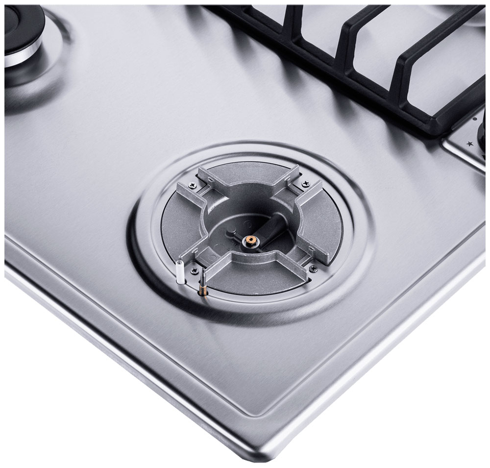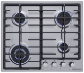 Описаниеповерхность газовая независимая, 60 см, газ на металле, 4 конфорки, решетки чугунные, нержавеющая сталь