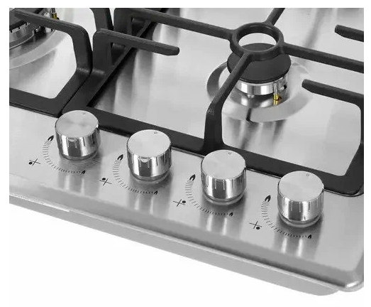 Описаниеповерхность газовая независимая, 60 см, газ на металле, 4 конфорки, решетки чугунные, нержавеющая сталь