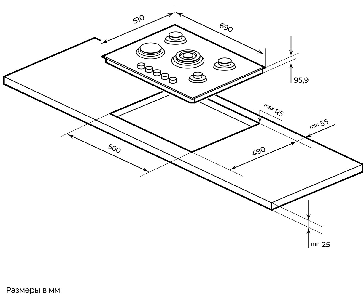 Описаниеповерхность газовая независимая, 70 см, газ на эмали, 5 конфорок, решетки чугунные, черный
