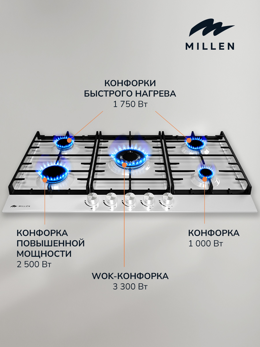 Размер (Глубина) 51 см Размер (Ширина) 87 см Цвет белый Ширина прибора 90 - 95 см Переключатели поворотные Управление механическое Таймер нет Фурнитура серебристая Гарантийный срок (месяцы) 36 Страна производитель Турция Ссылка на сайт производителя https://millen.shop/shop/varochnye-paneli/gazovye-varochnye-paneli/millen-mgh-901-wh/ Всего конфорок 5 Рабочая поверхность эмаль Количество газовых конфорок 5 Газ-контроль конфорок есть Решетки чугунные Тип поверхности газовая Электроподжиг есть Встроенная вытяжка нет Конфорка WOK 1 x 3300 Вт Расположение панели управления спереди Размер в упаковке (Высота) 15,5 см Размер в упаковке (Ширина) 56,5 см Размер в упаковке (Глубина) 94 см Размер (Ширина), см 87 Размер (Глубина), см 51 - Отзывы