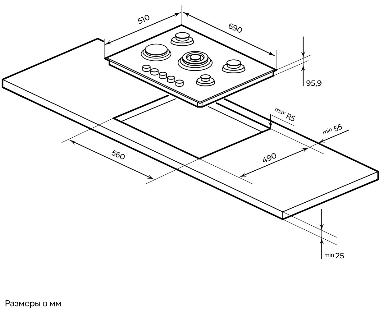 Описаниеповерхность газовая независимая, 70 см, газ на стекле, 5 конфорок, решетки чугунные, черный