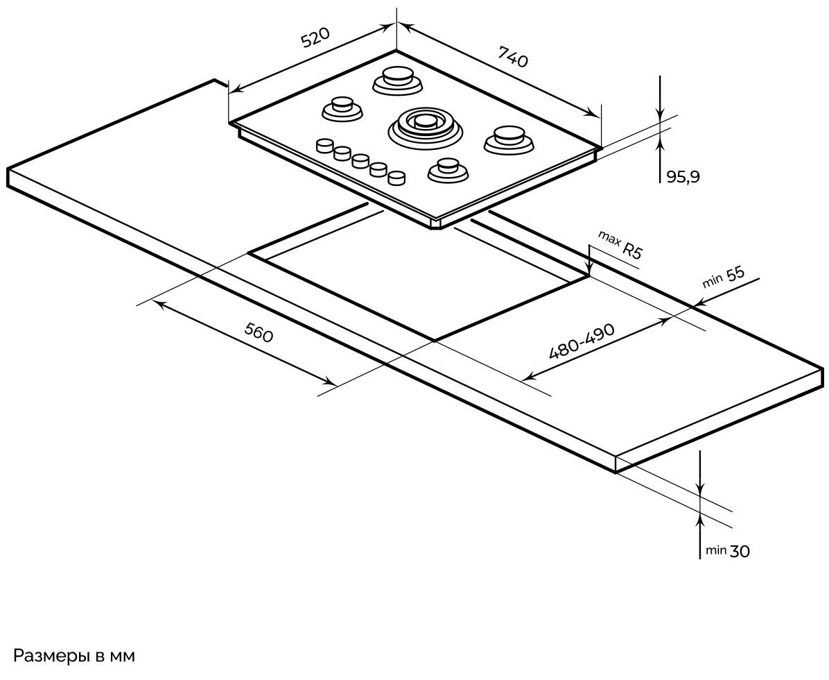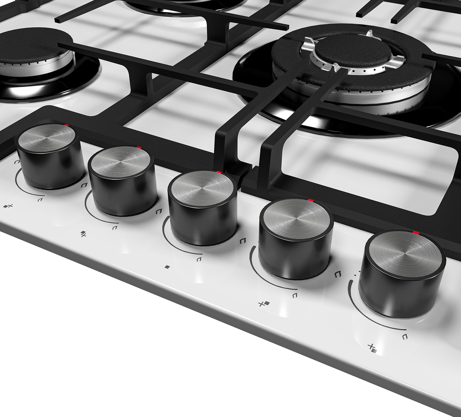 Описаниеповерхность газовая независимая, 75 см, газ на стекле, 5 конфорок, решетки чугунные, белый