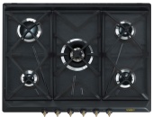 Описаниеповерхность газовая независимая, 70 см, газ на эмали, 5 конфорок, решетки чугунные, антрацит, фурнитура латунная
