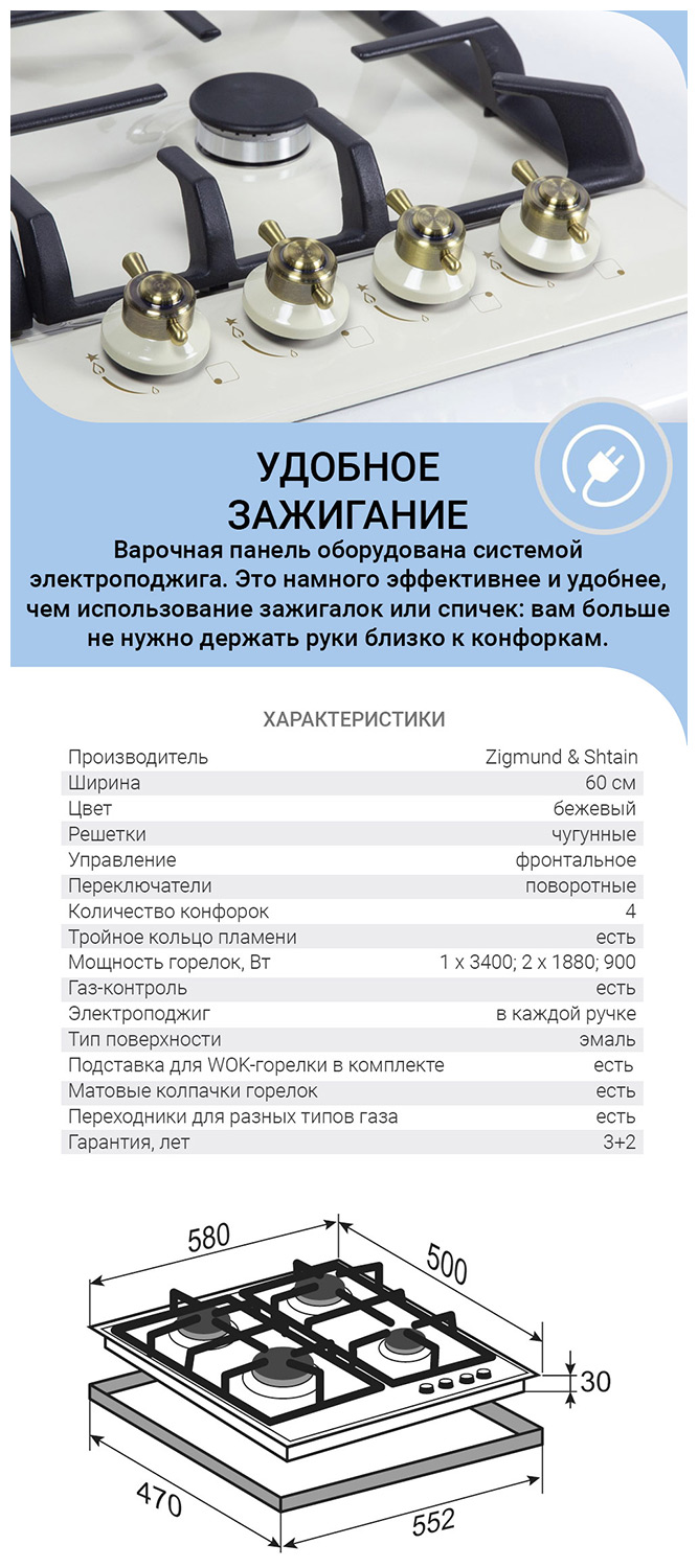 Размер (Высота) 6,1 см Размер (Глубина) 50 см Размер (Ширина) 58 см Цвет бежевый Ширина прибора 60 см Переключатели поворотные Управление механическое Таймер нет Фурнитура бронза Гарантийный срок (месяцы) 60 Страна производитель Китай Ссылка на сайт производителя https://www.zigmundshtain.ru/vstraivaemaya-tekhnika/zigmund__amp__shtain/5282/ Всего конфорок 4 Рабочая поверхность эмаль Количество газовых конфорок 4 Газ-контроль конфорок есть Решетки чугунные Тип поверхности газовая Электроподжиг есть Встроенная вытяжка нет Конфорка WOK 1 x 3400 Вт Расположение панели управления спереди Размер в упаковке (Высота) 16 см Размер в упаковке (Ширина) 56,5 см Размер в упаковке (Глубина) 56,5 см - Отзывы