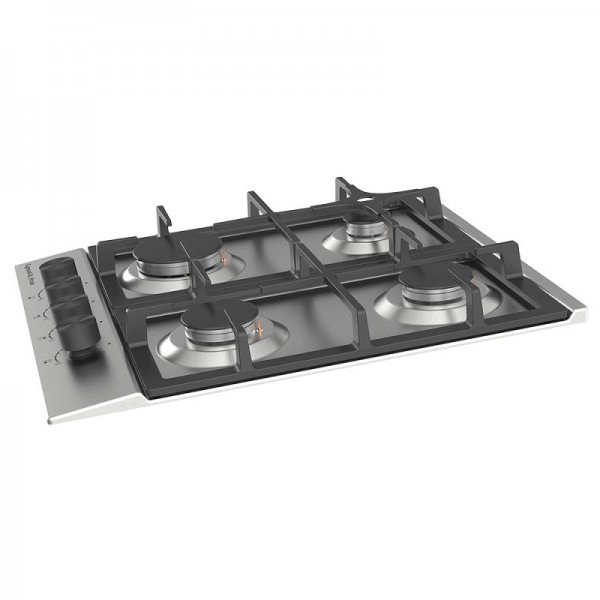 Описаниеповерхность газовая независимая, 45 см, газ на металле, 4 конфорки, решетки чугунные, нержавеющая сталь