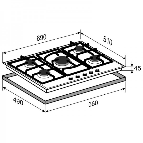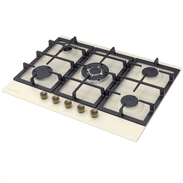 Описаниеповерхность газовая независимая, 70 см, газ на эмали, 5 конфорок, решетки чугунные, бежевый