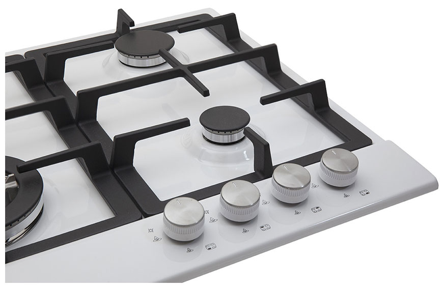 Описаниеповерхность газовая независимая, 60 см, газ на эмали, 4 конфорки, решетки чугунные, белый