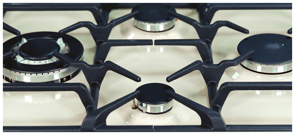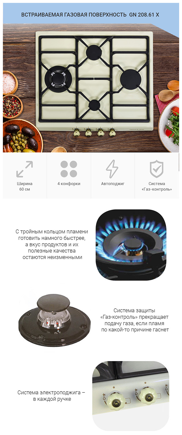 Описаниеповерхность газовая независимая, 60 см, газ на эмали, 4 конфорки, решетки чугунные, бежевый