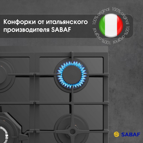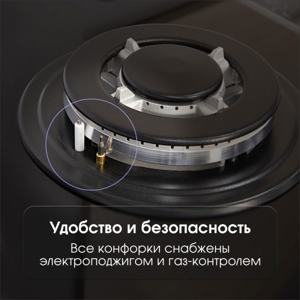 Описаниеповерхность газовая независимая, 60 см, газ на стекле, 4 конфорки, решетки чугунные, черный
