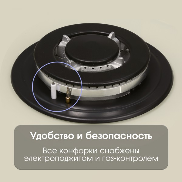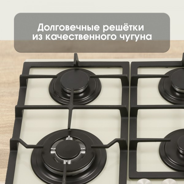 Описаниеповерхность газовая независимая, 60 см, газ на стекле, 4 конфорки, решетки чугунные, бежевый