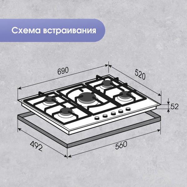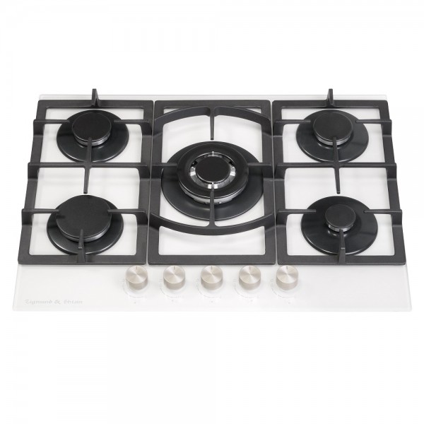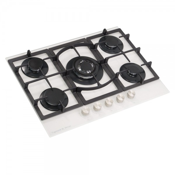 Описаниеповерхность газовая независимая, 70 см, газ на стекле, 5 конфорок, решетки чугунные, белый