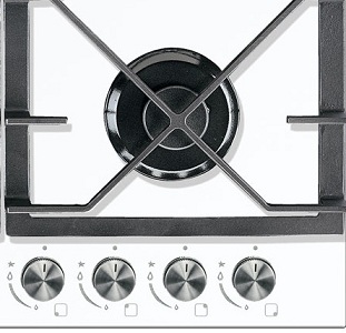 Описаниеповерхность газовая независимая, 60 см, газ на стекле, 4 конфорки, решетки чугунные, белый
