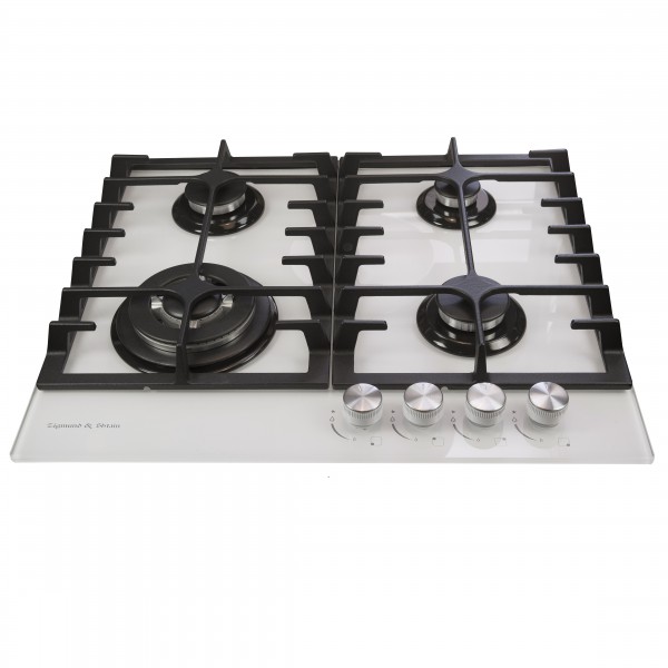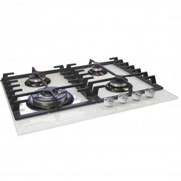 Описаниеповерхность газовая независимая, 60 см, газ на стекле, 4 конфорки, решетки чугунные, белый