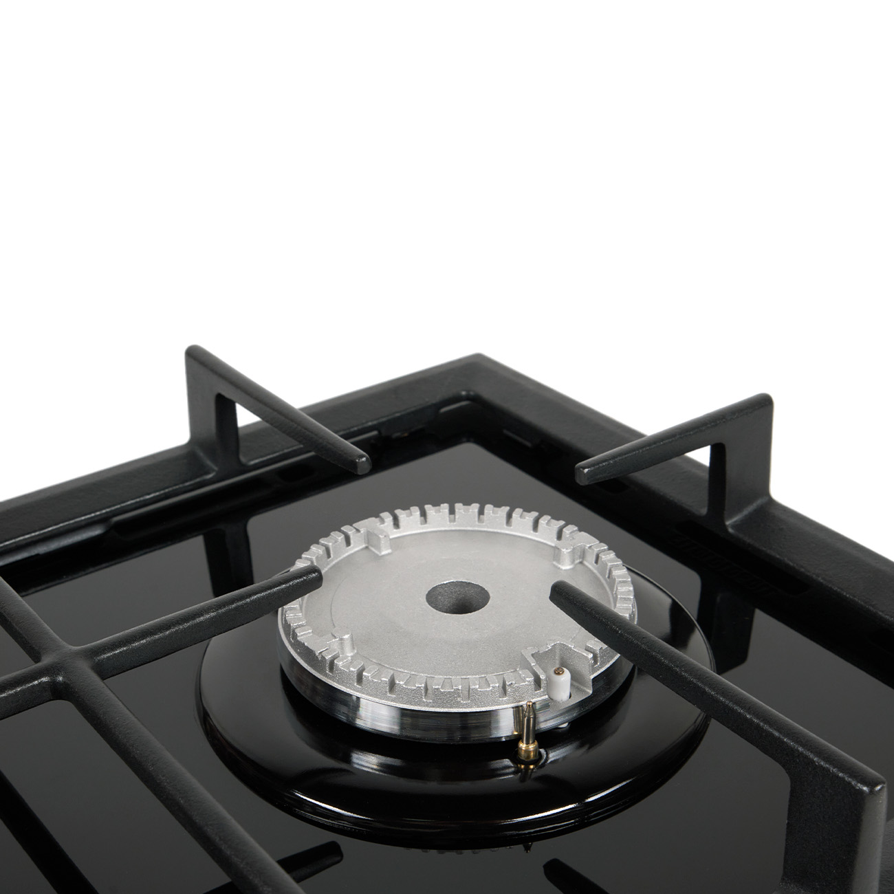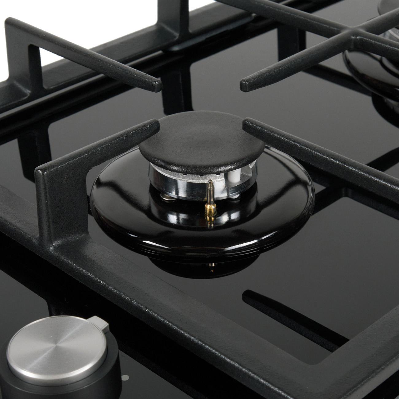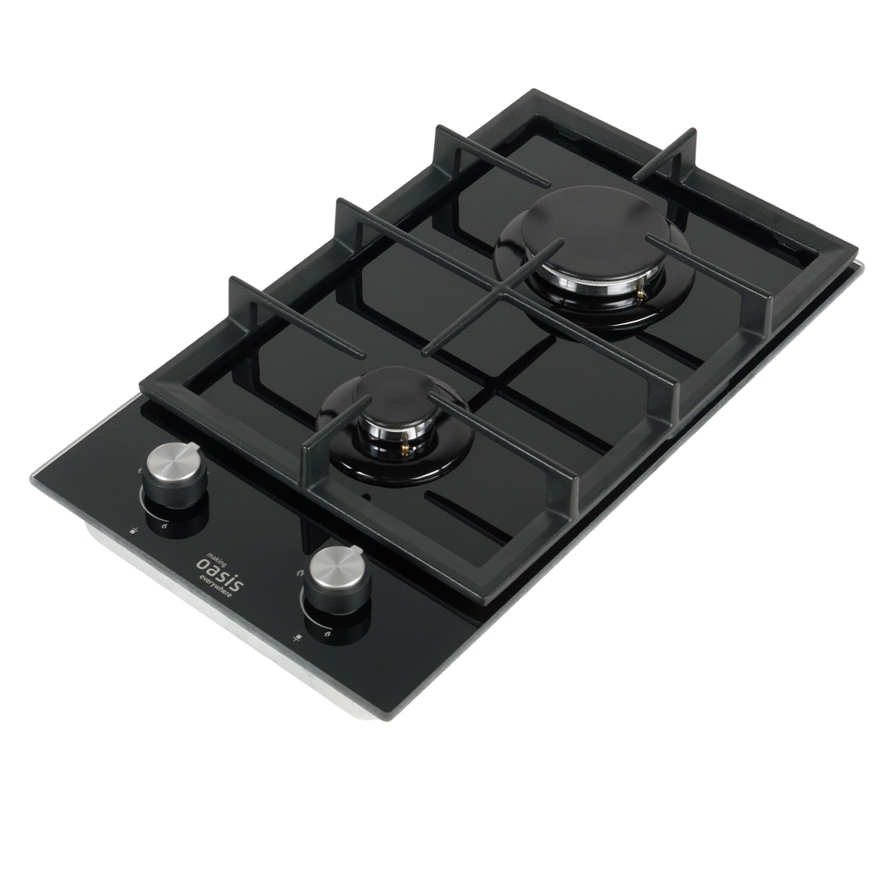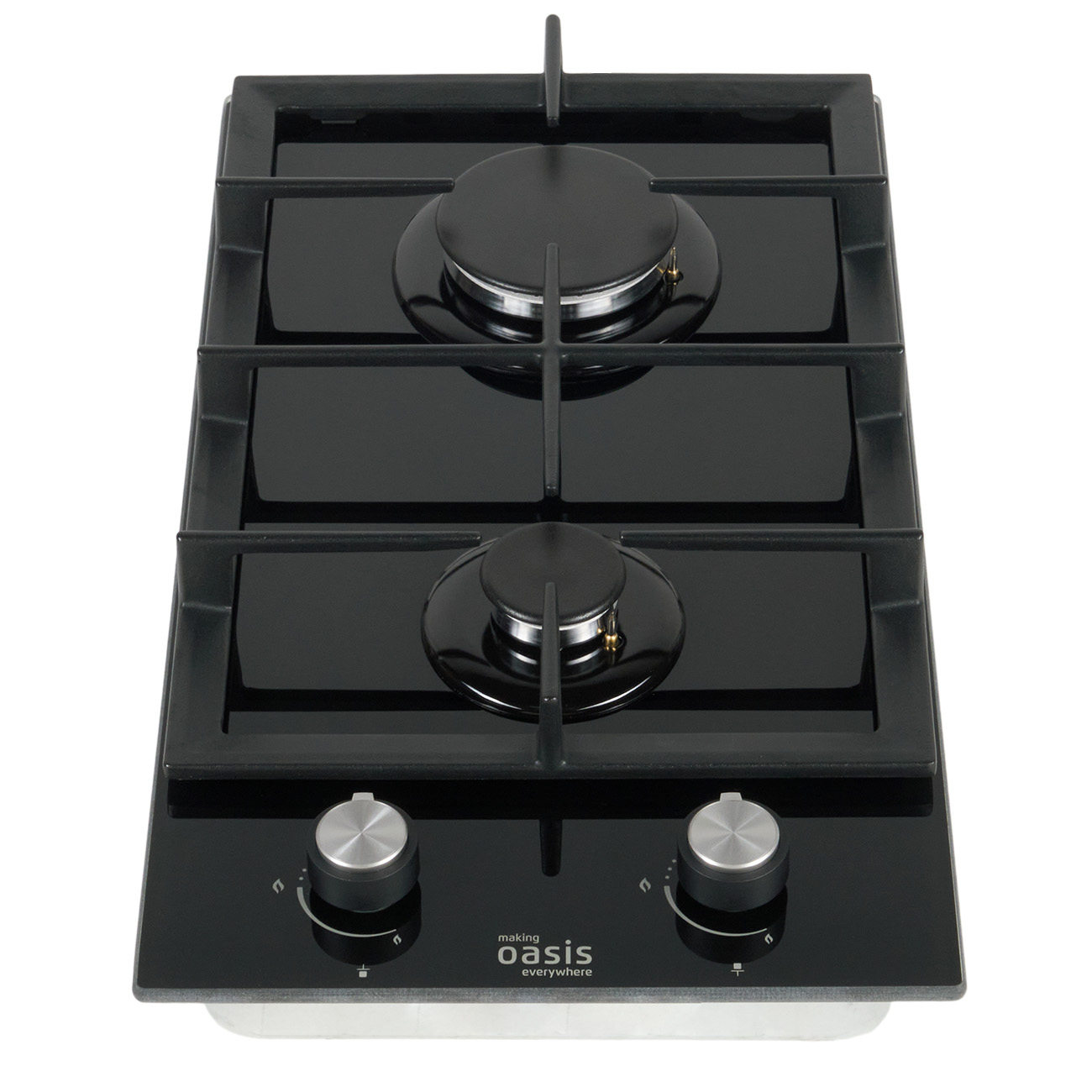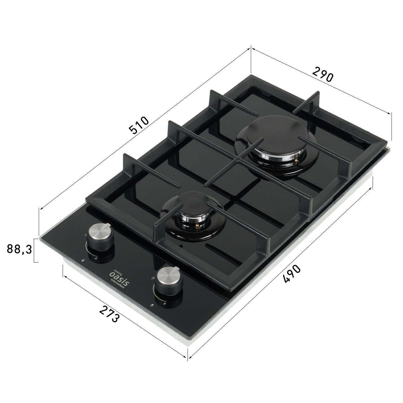 Описаниеповерхность газовая независимая, 30 см, газ на стекле, 2 конфорки, решетки чугунные, черный