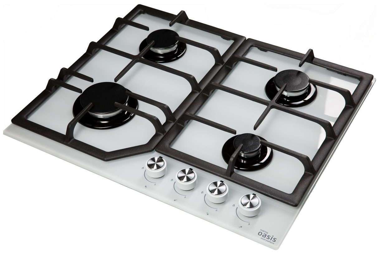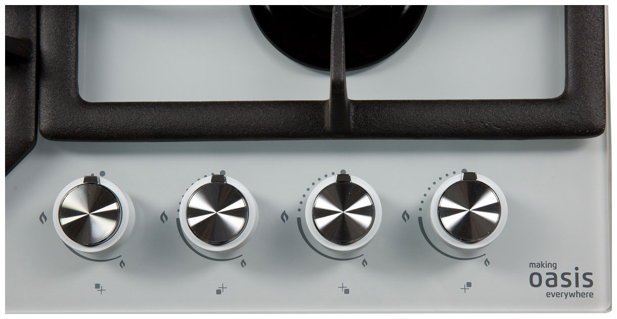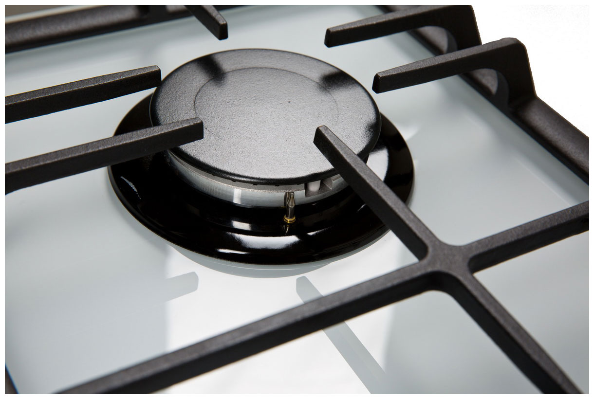 Описаниеповерхность газовая независимая, 60 см, газ на стекле, 4 конфорки, решетки чугунные, белый