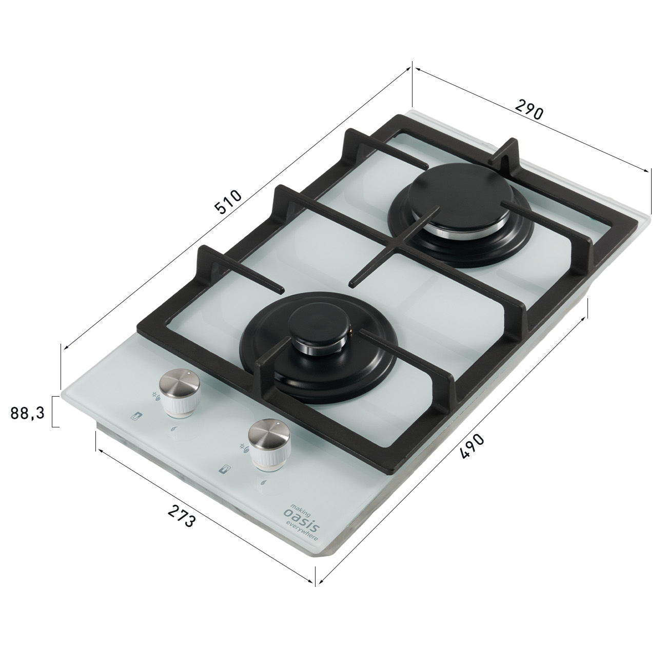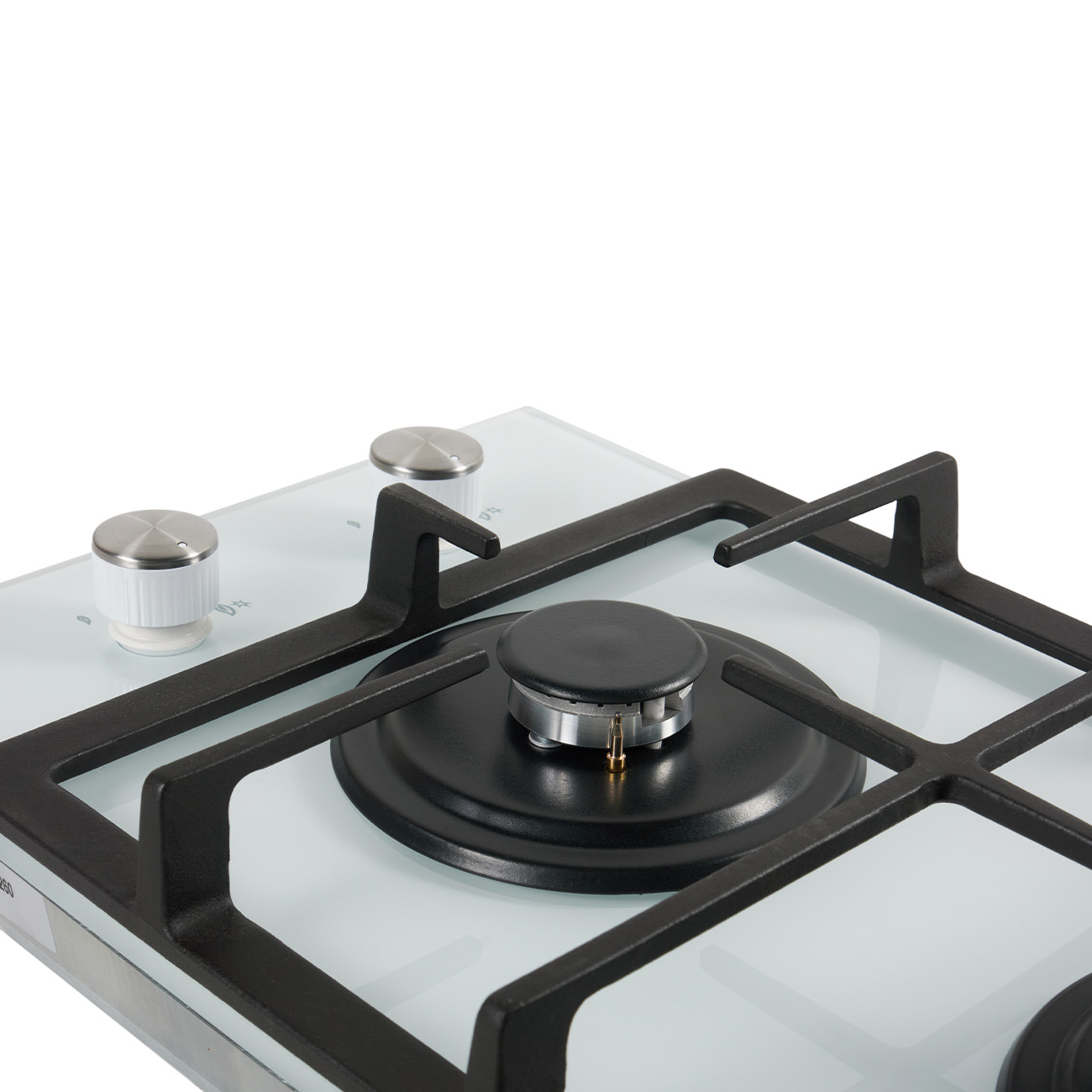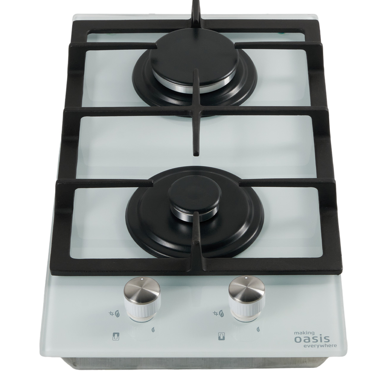 Описаниеповерхность газовая независимая, 30 см, газ на стекле, 2 конфорки, решетки чугунные, белый