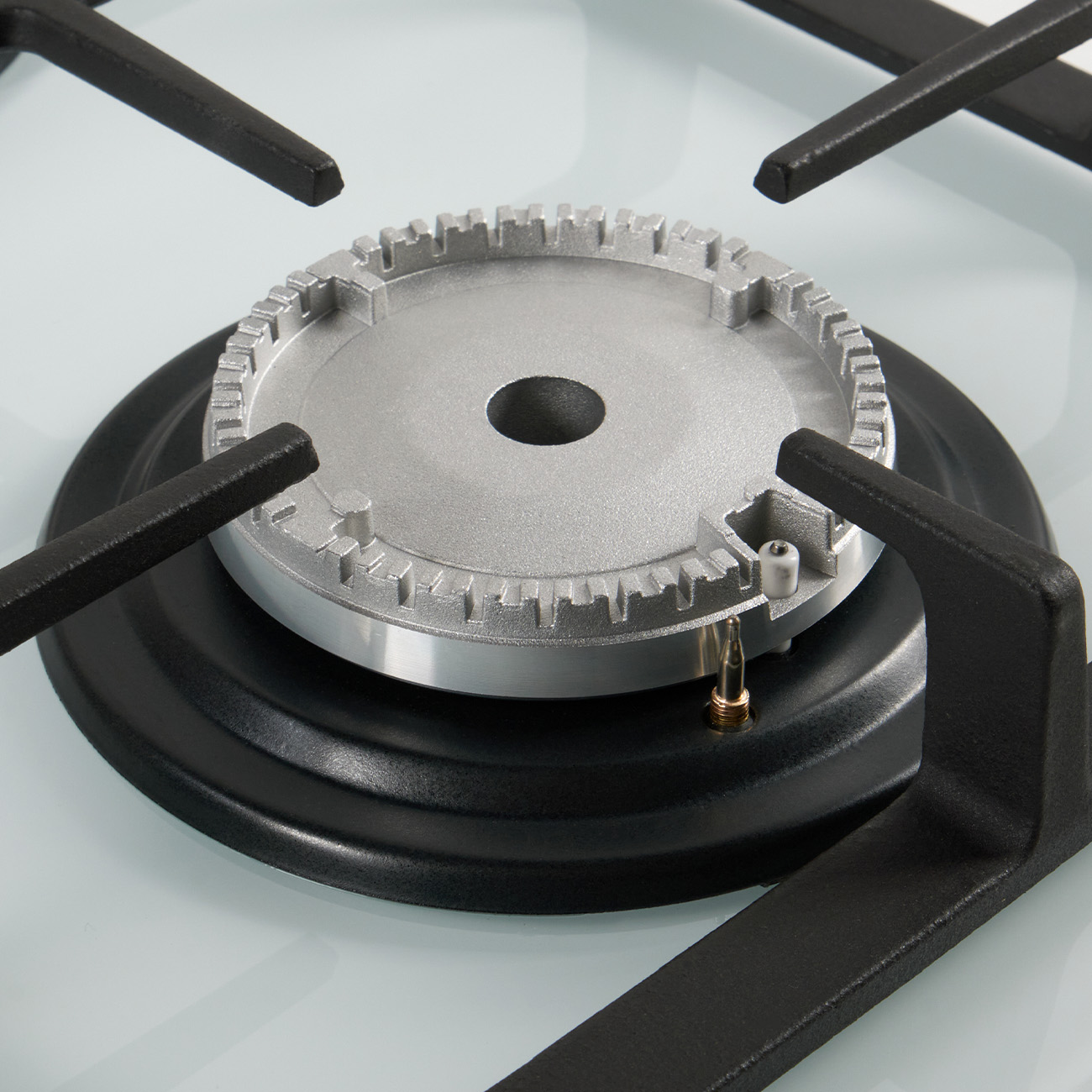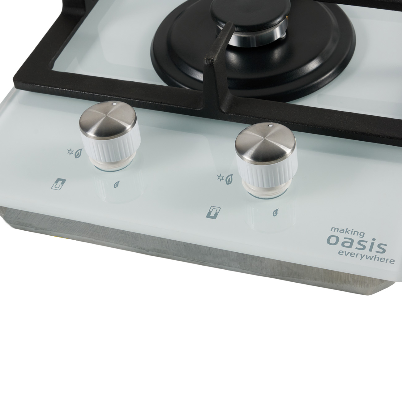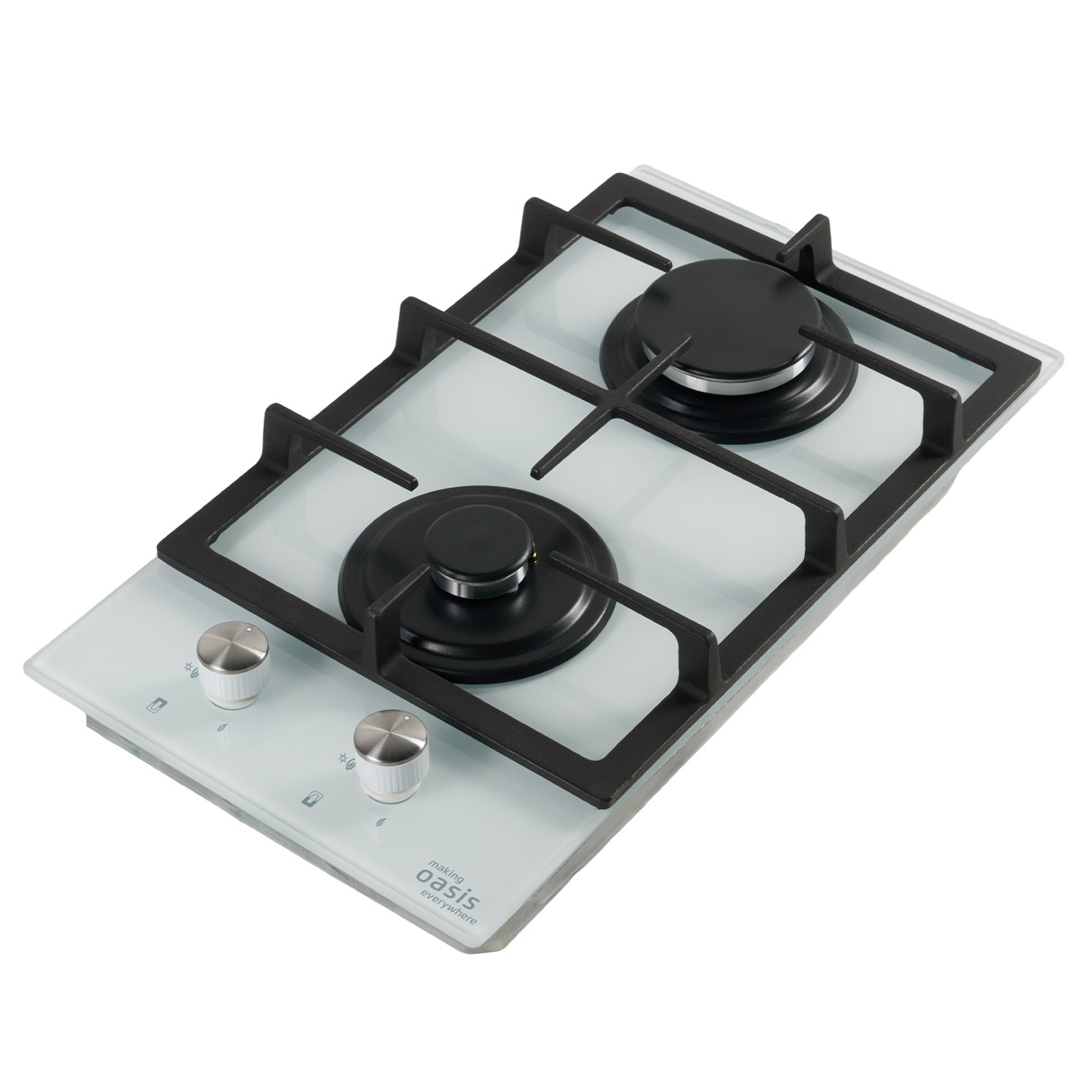 Описаниеповерхность газовая независимая, 30 см, газ на стекле, 2 конфорки, решетки чугунные, белый