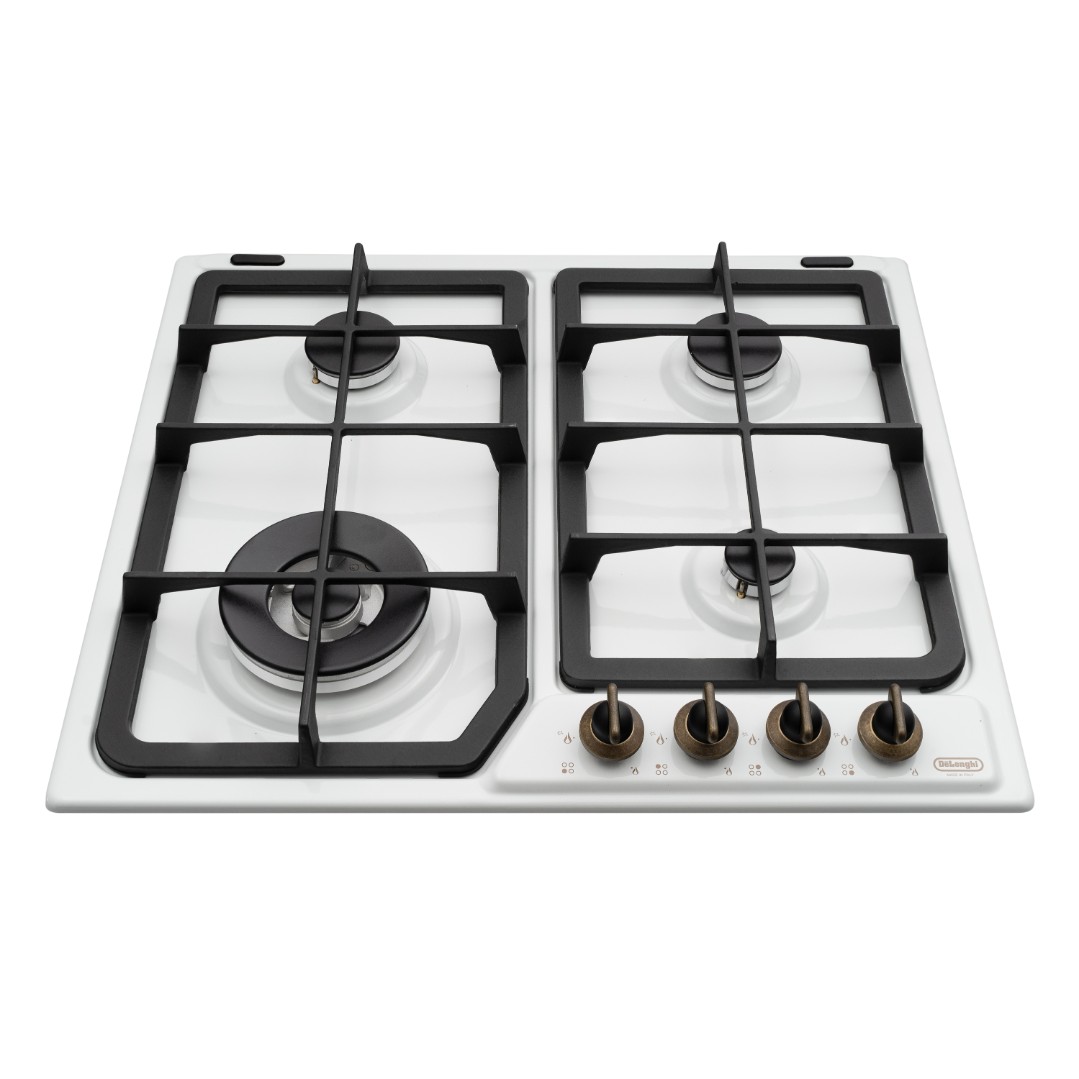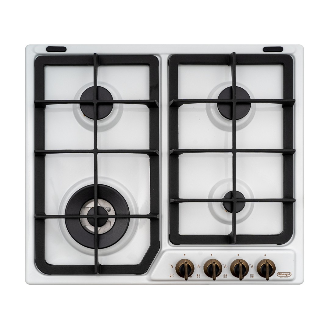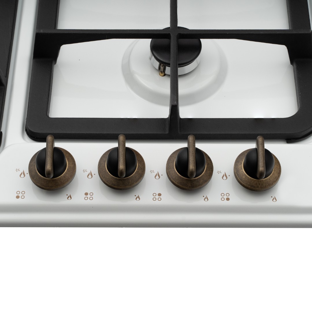 Описаниеповерхность газовая независимая, 60 см, газ на эмали, 4 конфорки, решетки чугунные, белый/ бронзовая фурнитура