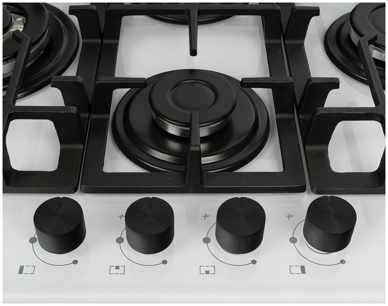 Описаниеповерхность газовая независимая, 65 см, газ на стекле, 4 конфорки, решетки чугунные, белый