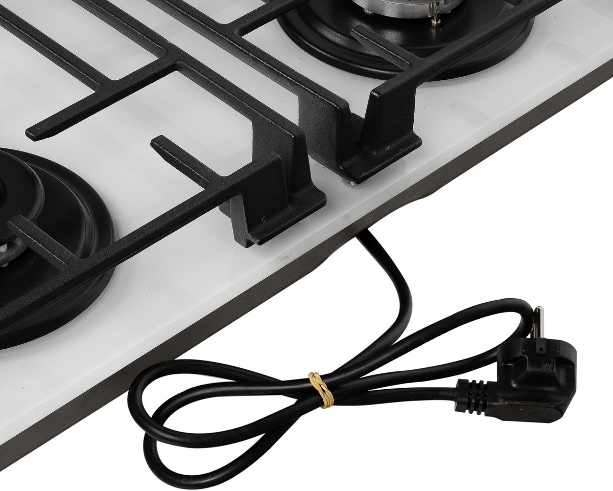 Описаниеповерхность газовая независимая, 60 см, газ на стекле, 4 конфорки, решетки чугунные, белый