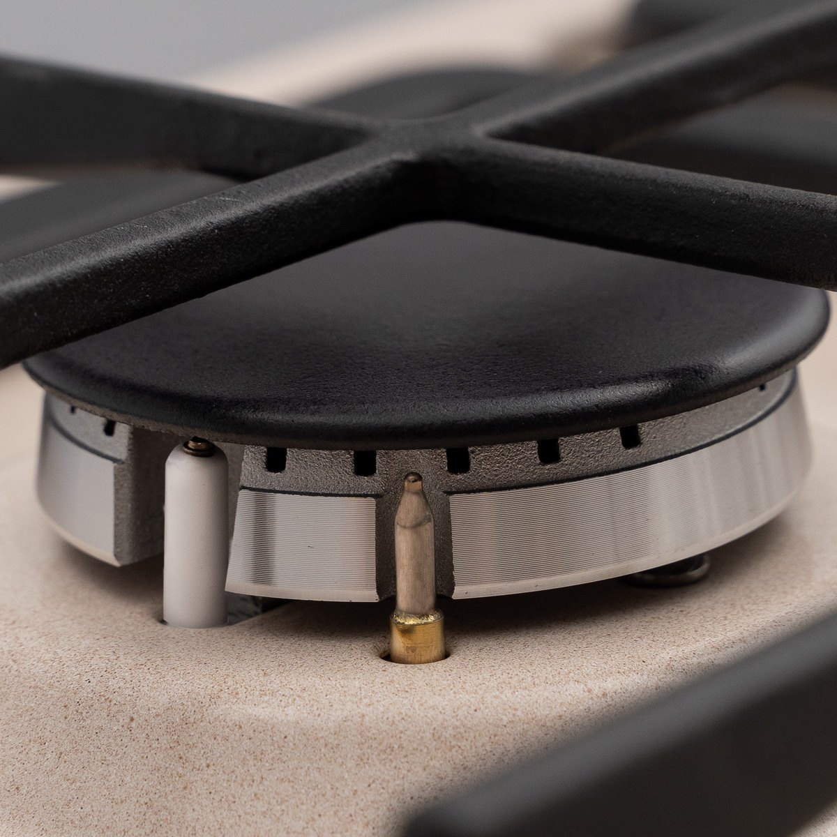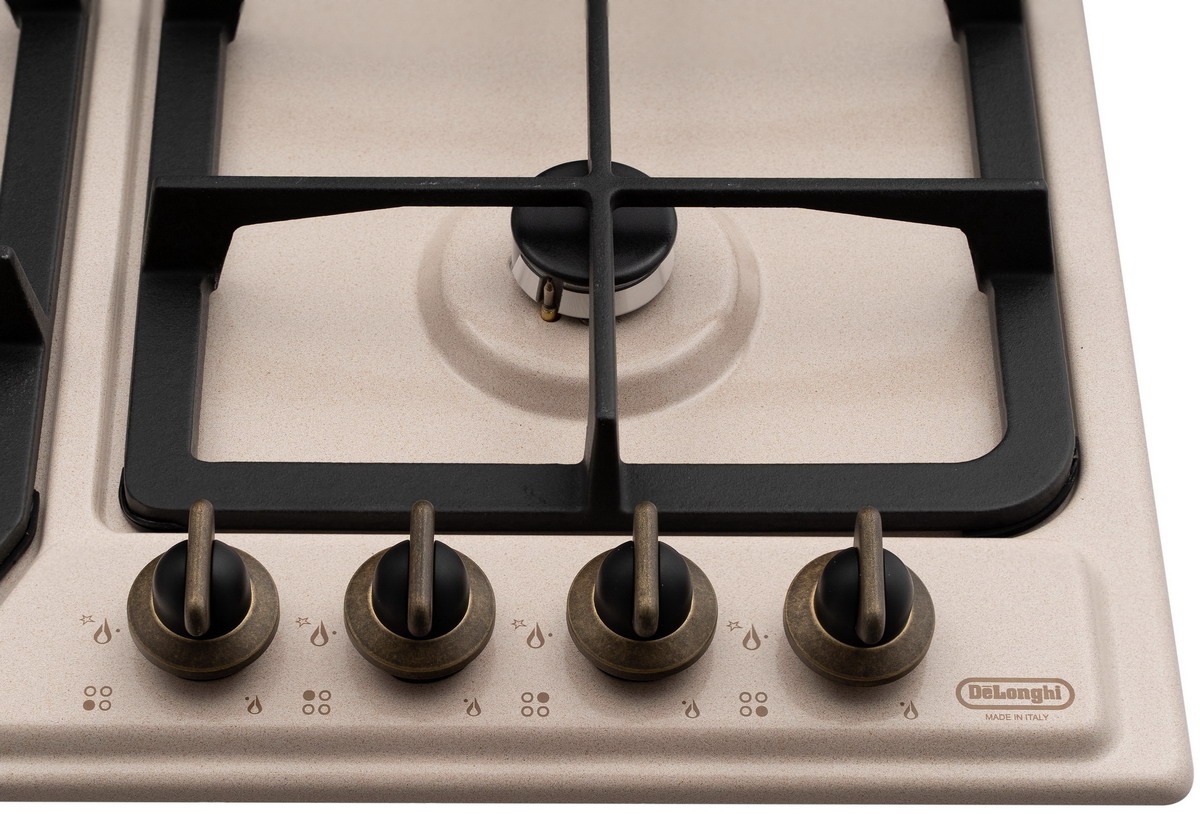 Описаниеповерхность газовая независимая, 60 см, газ на эмали, 4 конфорок, решетки чугунные, бежевый/ бронзовая фурнитура