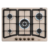 Описаниеповерхность газовая независимая, 70 см, газ на эмали, 5 конфорок, решетки чугунные, бежевый/ бронзовая фурнитура