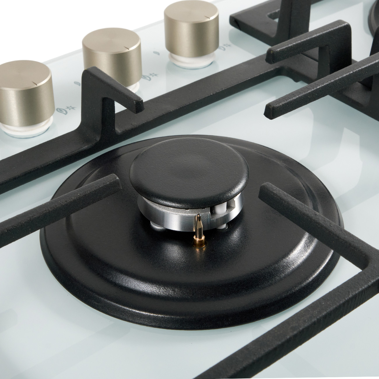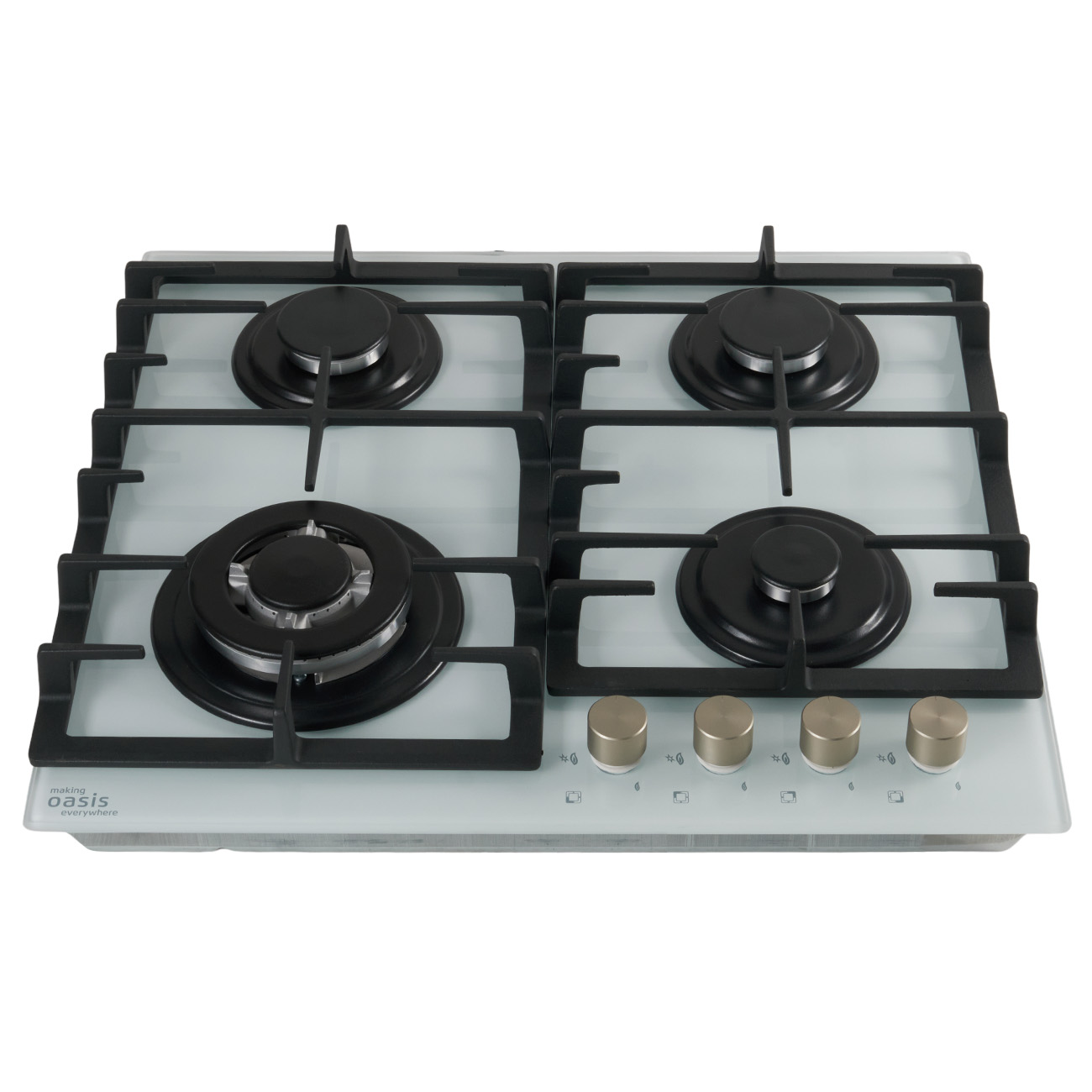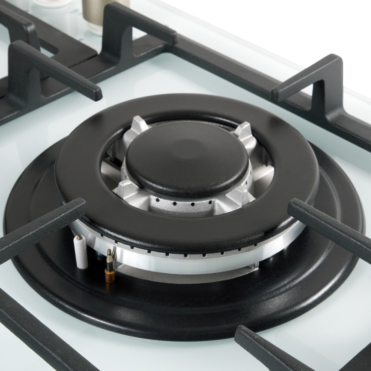 Описаниеповерхность газовая независимая, 60 см, газ на стекле, 4 конфорки, решетки чугунные, белый